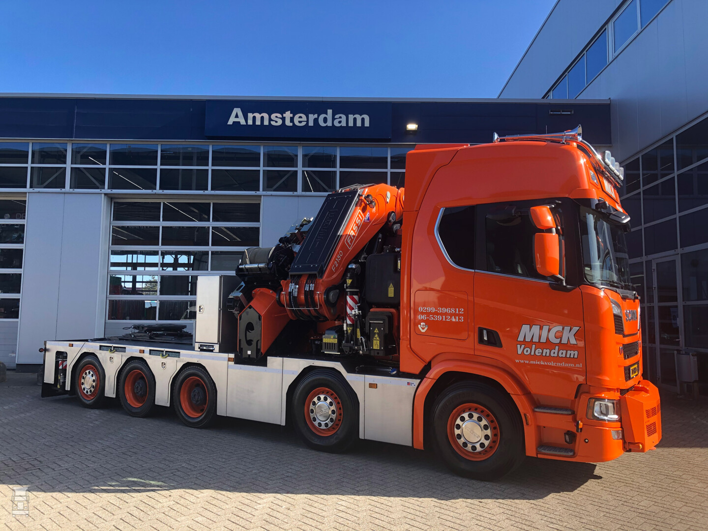 Met een Fassi cabinekraan van maar liefst 215 ton/meter, nam kraanbedrijf Mick uit Volendam deze maand de zwaarste cabinekraan in gebruik die ooit in Nederland op een Scaniachassis is gebouwd. Niet alleen de kraan is exceptioneel. Ook de Scania zelf is met zijn 10x4 configuratie, 650 pk sterke V8 motor en een hoge R-cabine een niet alledaagse verschijning.