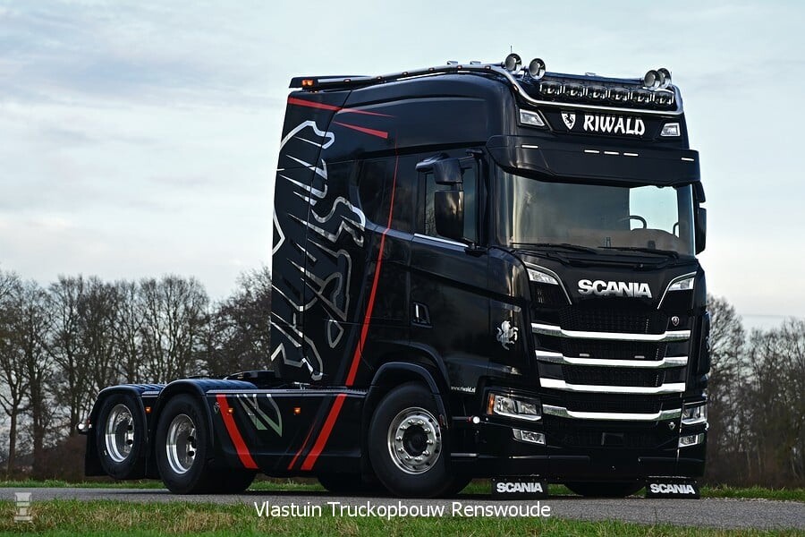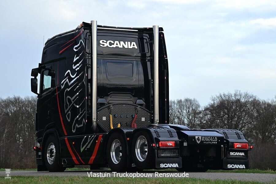 De sleepas trekker is uiteraard voorzien van een langere wielbasis om uit de voeten te kunnen met de verlengde cabine. Chauffeur Bjorn, die met de truck gaat rijden trekt afwisselend een schrootkipper of een euro-dieplader. De truck is uitgevoerd in een fraaie zwarte kleur met het Riwald logo fors bemeten op de zijkanten. Het resultaat is een ronduit indrukwekkende trekker. Wat het vermogen van deze Scania is blijft in het midden, maar het V8 logo in de grille geeft aan dat het in ieder geval een achtcilinder is.
