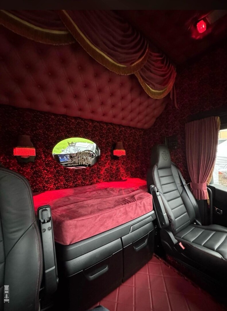 De transformatie van de nieuwe Scania is goed gelukt. De bumper en de verstralers in de grille en zonneklep doen de Scania echt aan zijn oudere broertje denken. Boven de voorruit is slim met zwarte lijnen het dak van een 4-serie gesimuleerd. Klassieke toplichten en opgeknapte Matexon-luchthoorns maken het plaatje compleet. Tot slot is het dashboard voorzien van notenhouten accenten en is de cabine bekleed door BAT Truck Interior.