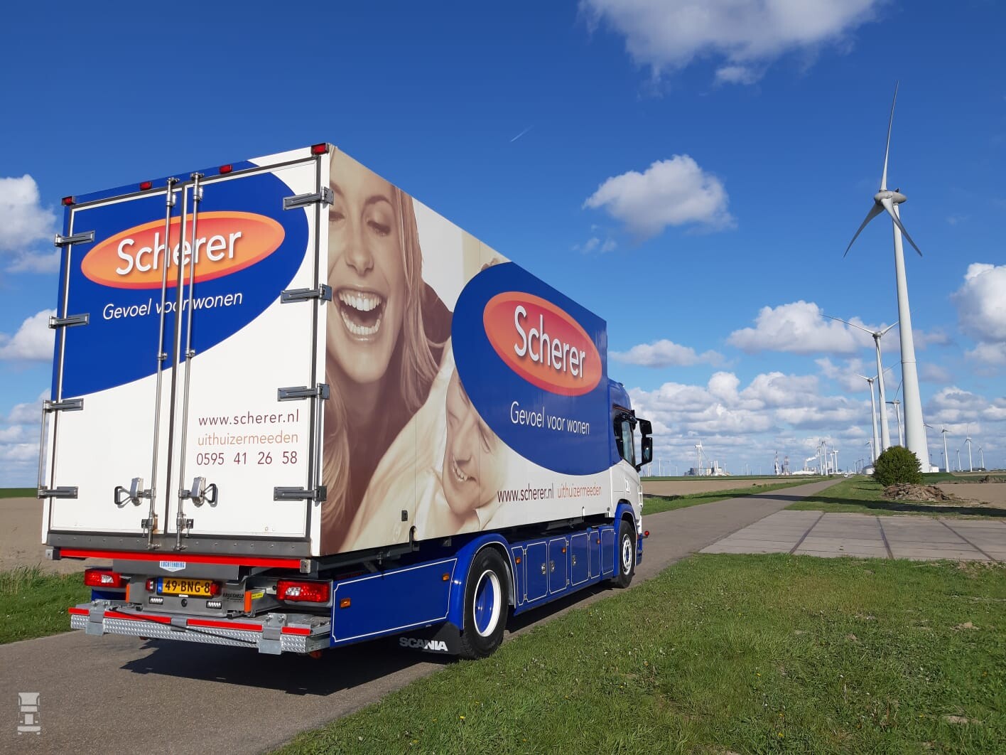 Scherer Wonen in Uithuizermeeden bezorgt zijn meubelen voortaan in stijl. De 12 jaar oude DAF werd vervangen door een nieuwe Scania P220 met slaapcabine. De nieuwe Scania werd bijzonder fraai opgebouwd en in de lak gezet waardoor het een opvallende truck geworden is.