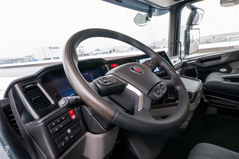 De Scania King’s Blue Limited Edition is een opvallende verschijning die ongetwijfeld populair zal blijken. De cabine is gespoten in Sapphire Blue Metallic, terwijl het chassis en grille zijn afgewerkt in glanzend zwart. Unieke graphics, die een gestileerde griffioen voorstellen, maken van de Scania een echte blikvanger. Op de zijskirts staat een eikenblad, wat verwijst naar het ‘eiken jubileum’ dat hoort bij 80 jaar. De vrachtwagen is netjes opgebouwd, inclusief zonneklep.