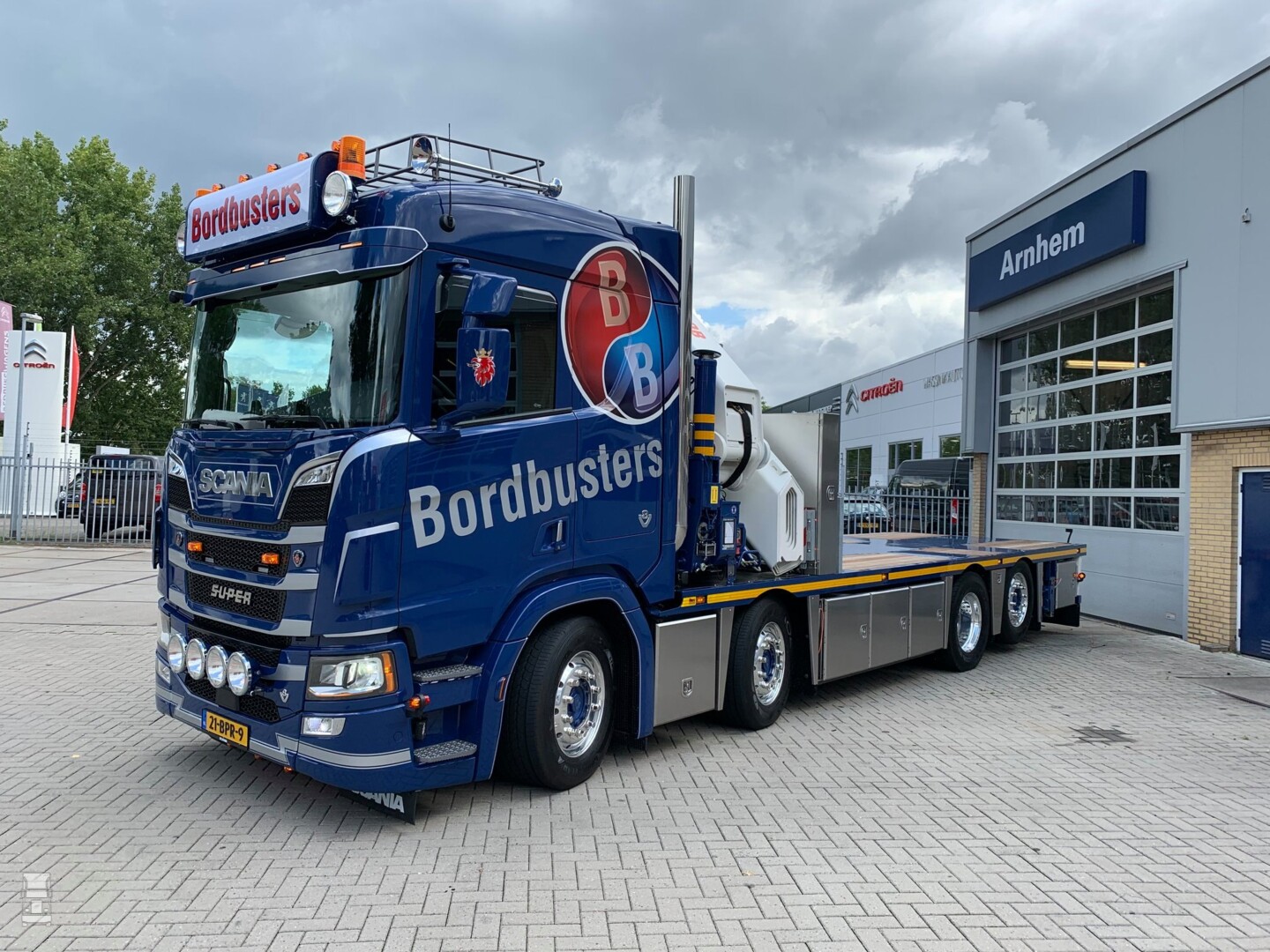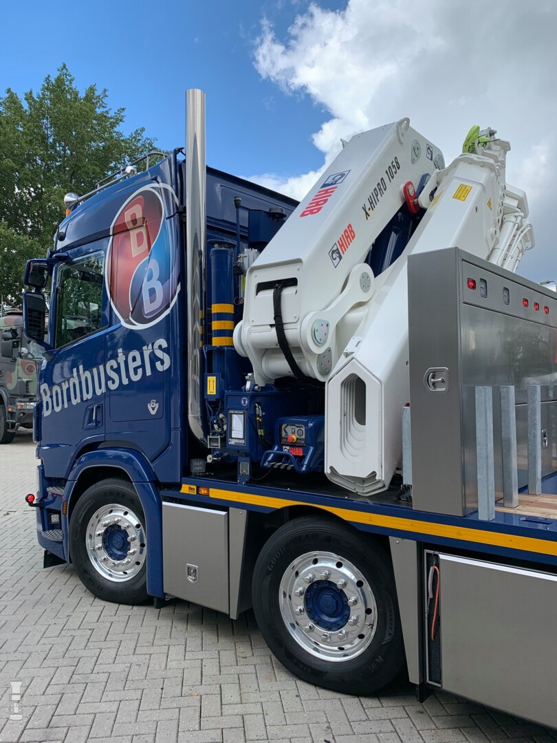 Bordbusters heeft een nieuwe Scania R 650 V8 in gebruik genomen. De 8x2 motorwagen is voorzien van de Scania R cabine met normaal dak met daar achter korte zijfenders en twee dikke RVS uitlaatpijpen. Het dakrekje met de lichtbak maken het plaatje helemaal af.