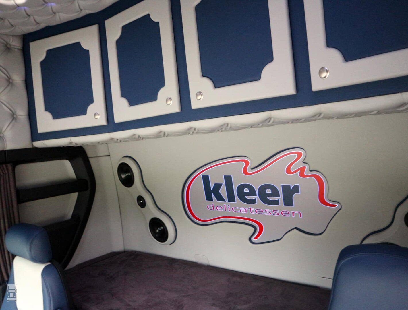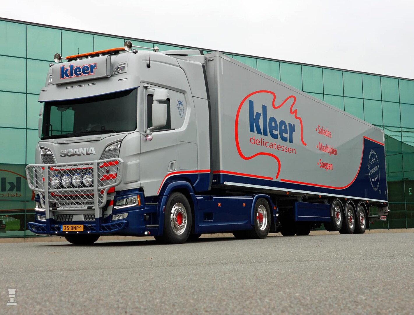 Chauffeur Marco van Vliet rijdt voor Kleer Delicatessen uit Kwintsheul. Sinds vandaag doet hij dat in stijl met zijn nieuwe combinatie. Voor een gloednieuwe Heiwo oplegger staat een bijzonder fraai uitgeruste Scania R450.
