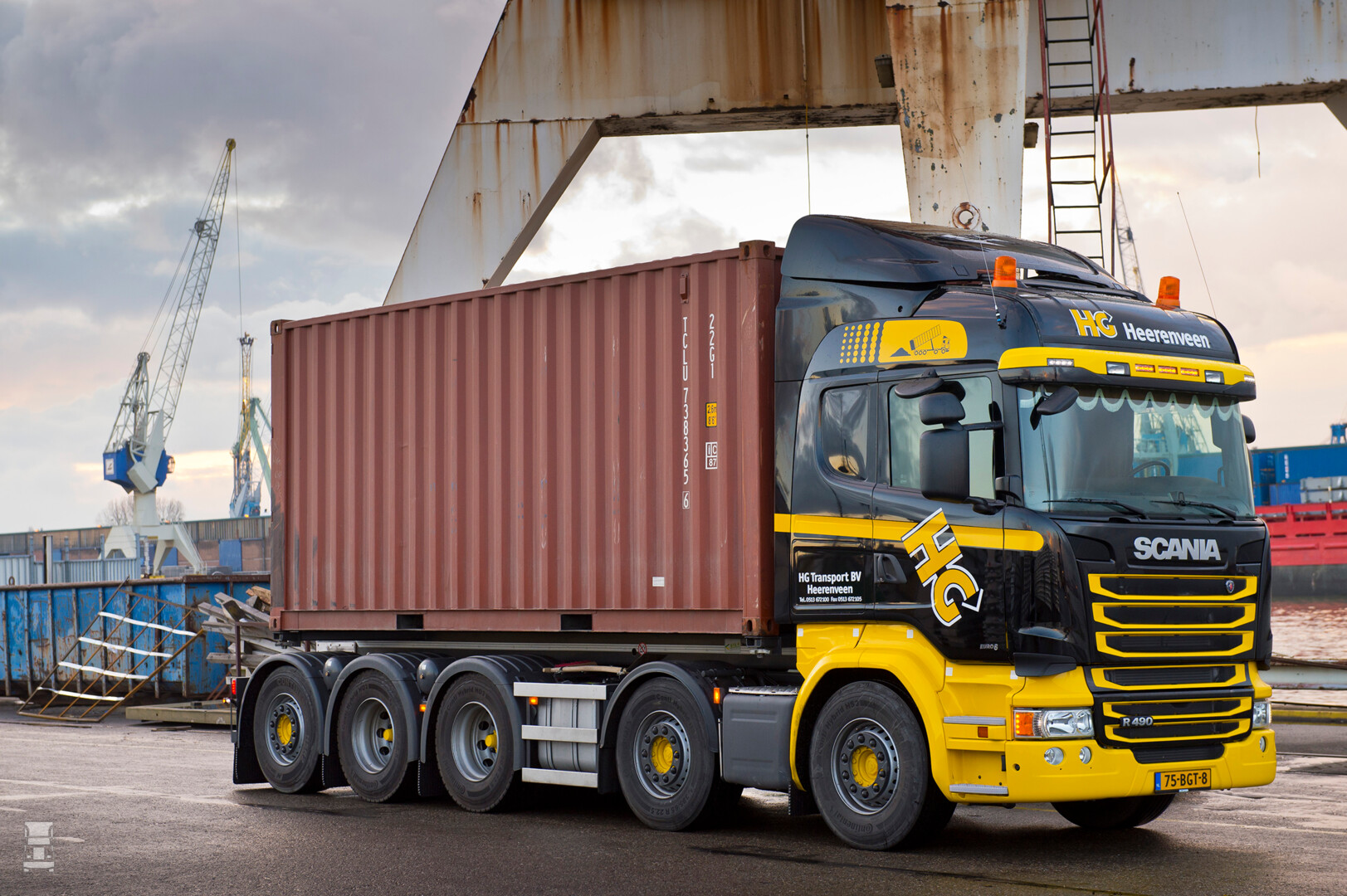 De Scania met zijn opbouw wordt ingezet voor het vervoer van metaalschroot in 20 voet zeecontainers. Om die reden is er gekozen voor een afzetsysteem. Het bijzondere is dat via een hydraulisch beweegbaar frame de container over een lengte van 1,50 meter naar voren of juist naar achter geschoven kan worden. Daarmee kan de chauffeur de aslasten optimaal benutten en overbelading op één of meerdere assen voorkomen.