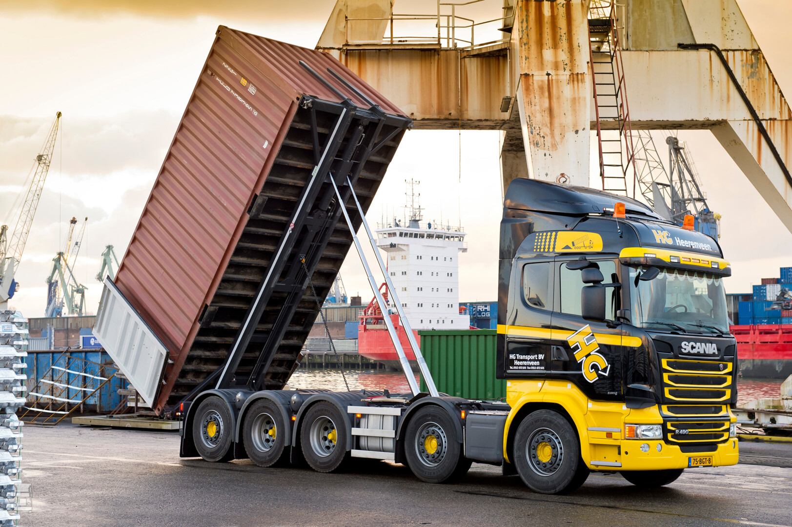“Wij zijn gespecialiseerd in het transport van schroot. Het probleem daarbij is dat het gewicht in een container soms heel ongelijk is verdeeld”, aldus directeur Harm van de Wal van HG. “Daardoor is het soms lastig om het gewicht netjes over de assen te verdelen zonder één of meer assen te overbeladen. Met als gevolg dat wij geen andere keus hebben dan binnendoor te rijden als we niet het risico willen lopen weeglusboetes te krijgen.” Omdat beide opties niet bevorderlijk zijn voor de bedrijfsvoering, kwam men bij HG op het idee het kiepframe ook naar voren en achteren beweegbaar te ontwerpen. Dat men een vijfasser wilde met twee sturende voorassen en een gestuurde naloopas vanwege het netto laadvermogen van 31 ton hielp daarbij.