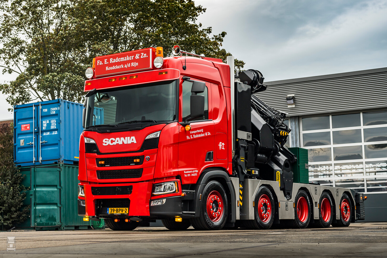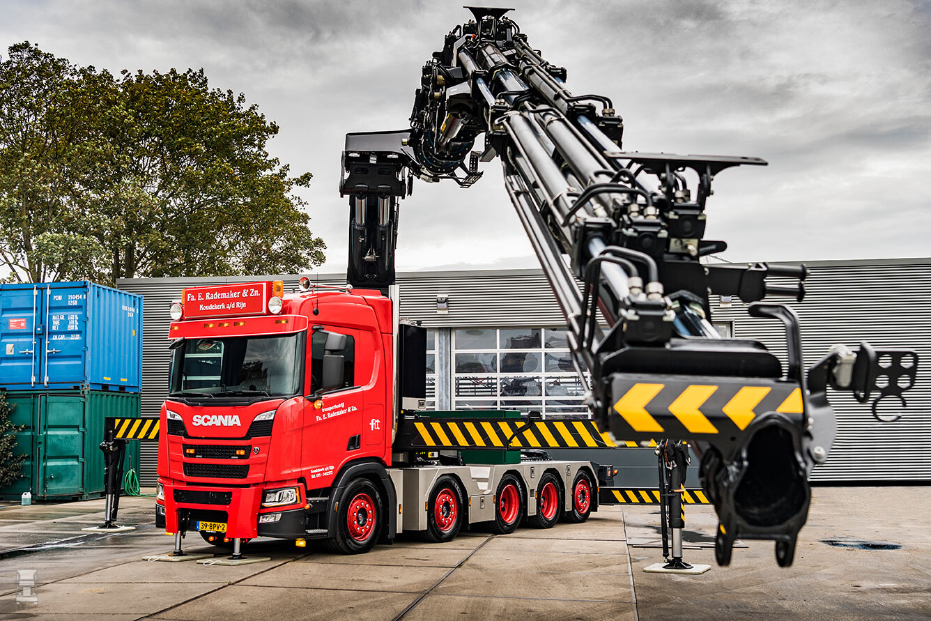 Breda - Rademaker Transport uit Koudekerk aan den Rijn rijdt sinds kort met een zeer bijzondere Scania R500 10x4 met een zes keer gestempelde 165 ton/m Palfinger cabinekraan. Rademaker maakte de truck superwendbaar door het chassis met 30 centimeter in te korten met behoud van de 45 ton GVW.
