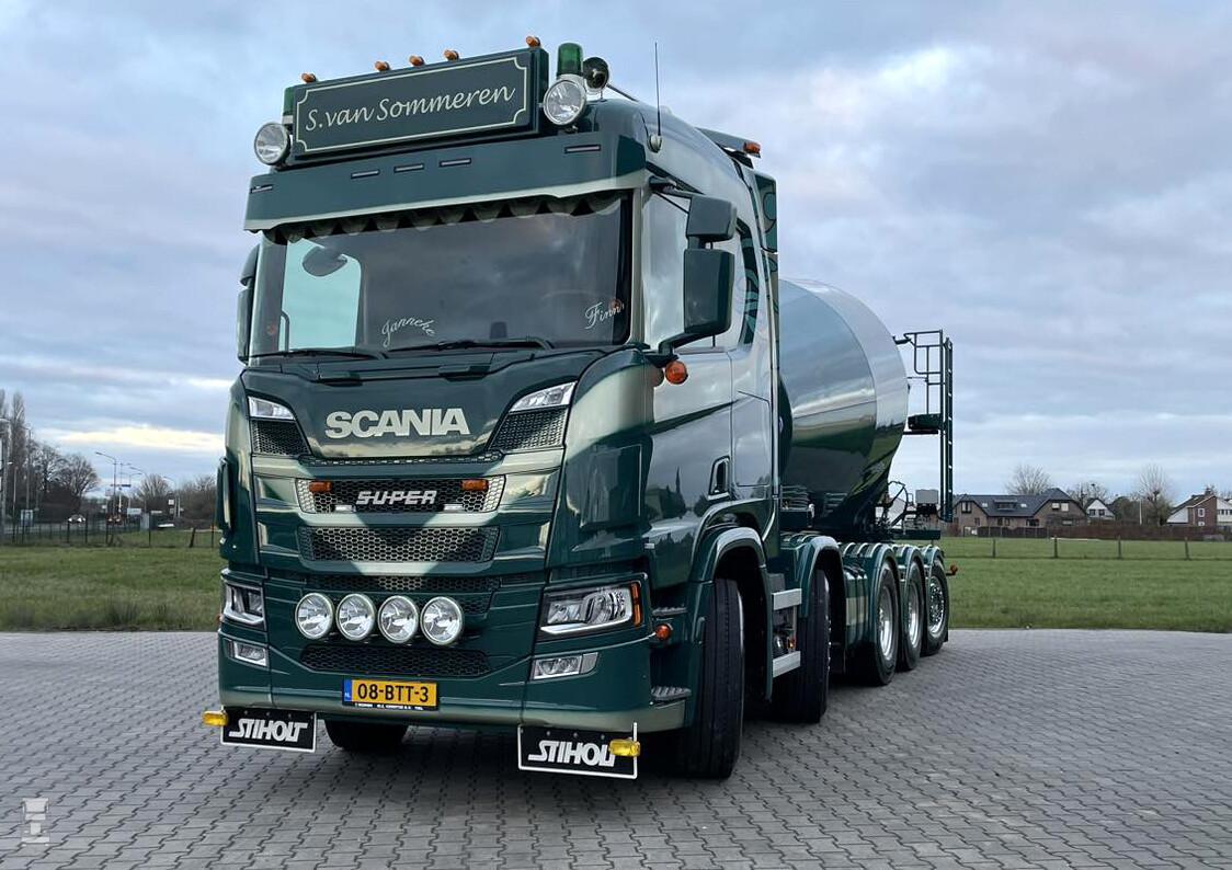 De Scania werd uitgevoerd in de smaakvolle kleuren van S. Van Sommeren en werd voorzien van een verlengde zonneklep, een lichtbak met verstralers en een extra set verstralers in de grille. Een setje Deense dagrijlampen met Stiholt spatlappen maken de 'oldskool' looks compleet.