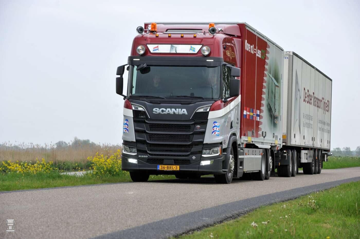 De Boer is al geruime tijd actief met LZV combinaties voor het transport van groupage ladingen van en naar Scandinavië. Met deze nieuwe Scania is de vierde LZV nu een feit, aan nummer vijf wordt gewerkt. Opvallend is de keuze voor een afzetbak met zijdeuren en een grote inwendige hoogte van Krone. Hiermee is belading van de zijkant mogelijk en dat is een mooi alternatief voor schuifzeilen. De Boer liet de laadbak voorzien van een fraaie reclame uiting met een foto van één van de andere LZV combinaties.