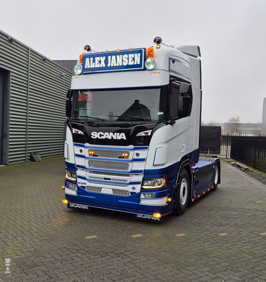 De nieuwe Scania werd fraai in de bekende kleuren gezet en voorzien van de nodige extra's. Zo zien we een verlengde zonneklep, een stoere lichtbak, windkapjes op de hoeken en een extra onderspoiler. Deze accessoires werden geleverd door #goinstyle, #omnius, #turbotruckparts en #Foxparts.
