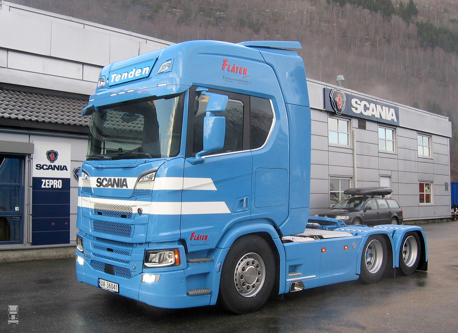 De trekker is gekocht door Flåten Termotransport AS, een vaste charter voor Tenden. Opvallend is dat deze Noor dus niet koos voor de S- cabine met vlakke vloer maar voor het meer traditionele model. Groot voordeel van deze truck is dat hij slechts drie instaptredes heeft. Het nadeel is de wat kleinere opbergruimte onder het bed en de kleinere koelkast.