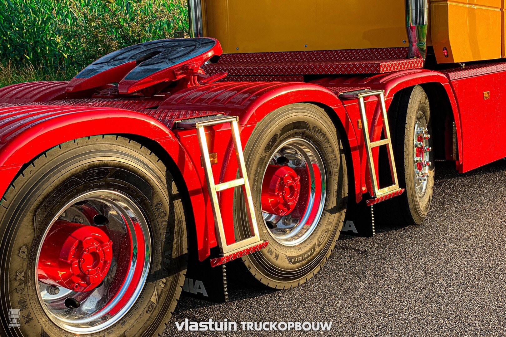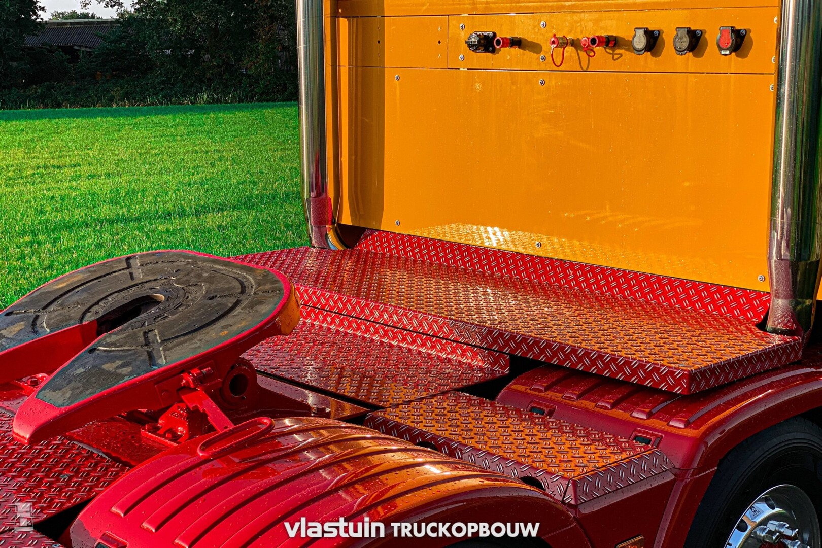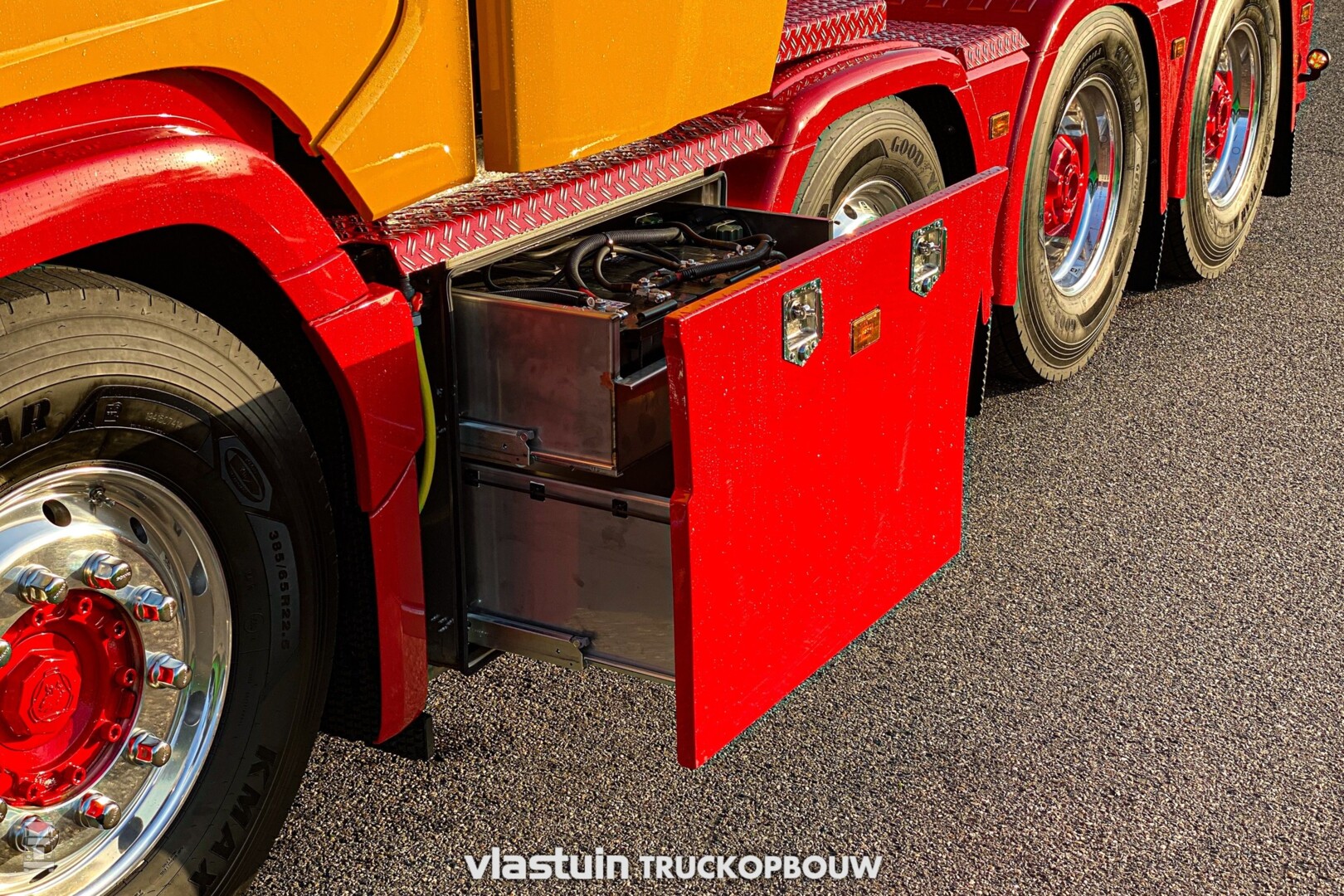 Verder werd er een fraaie kistenwand achter de cabine gemaakt met daarin tanks voor water en brandstof. Ook de luchtketels vonden hier een plek. Naast die kastenwand staan twee stoere staande uitlaten. Het hele chassis werd voorzien van een vlonder met opstap laddertjes, er werden 'strings' aangebracht tussen de assen en de trekker kreeg een hydrauliek installatie. Ook de achterbumper werd geheel op maat gemaakt.