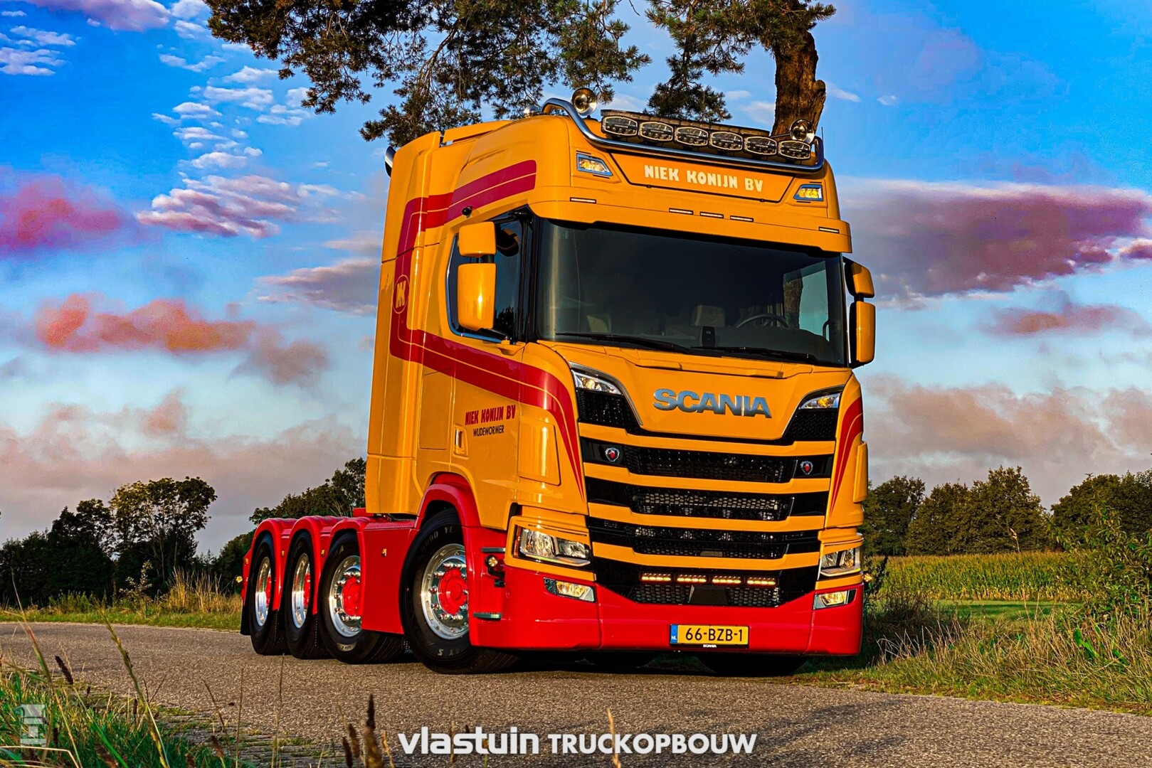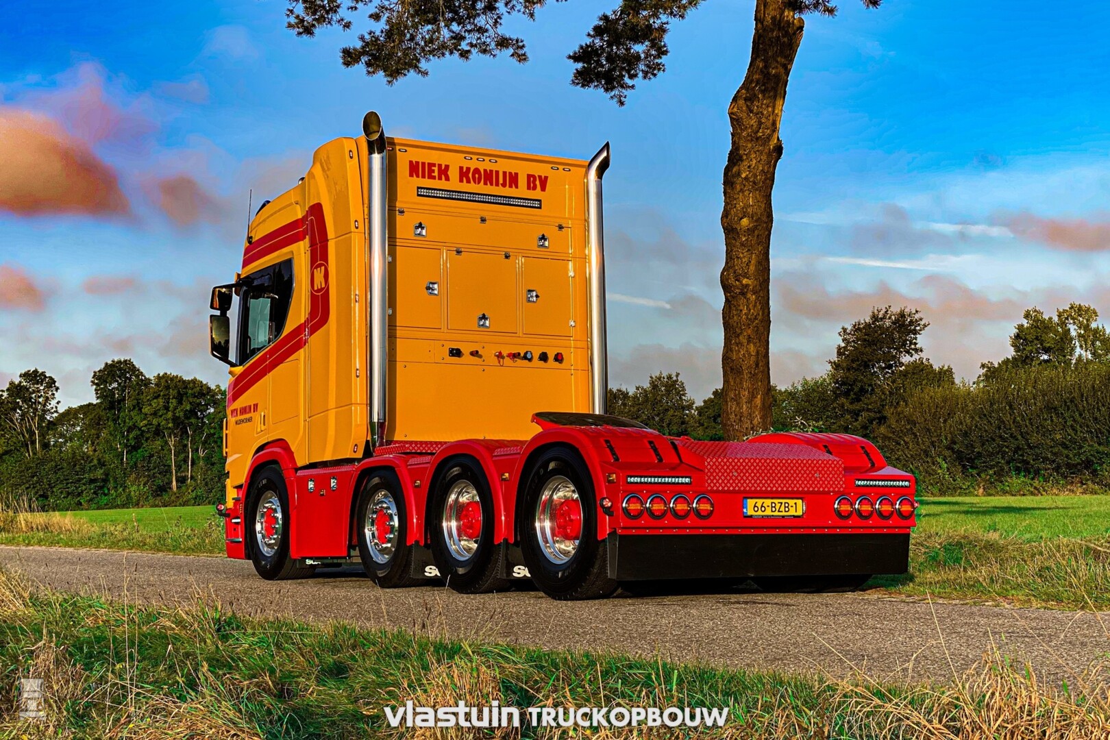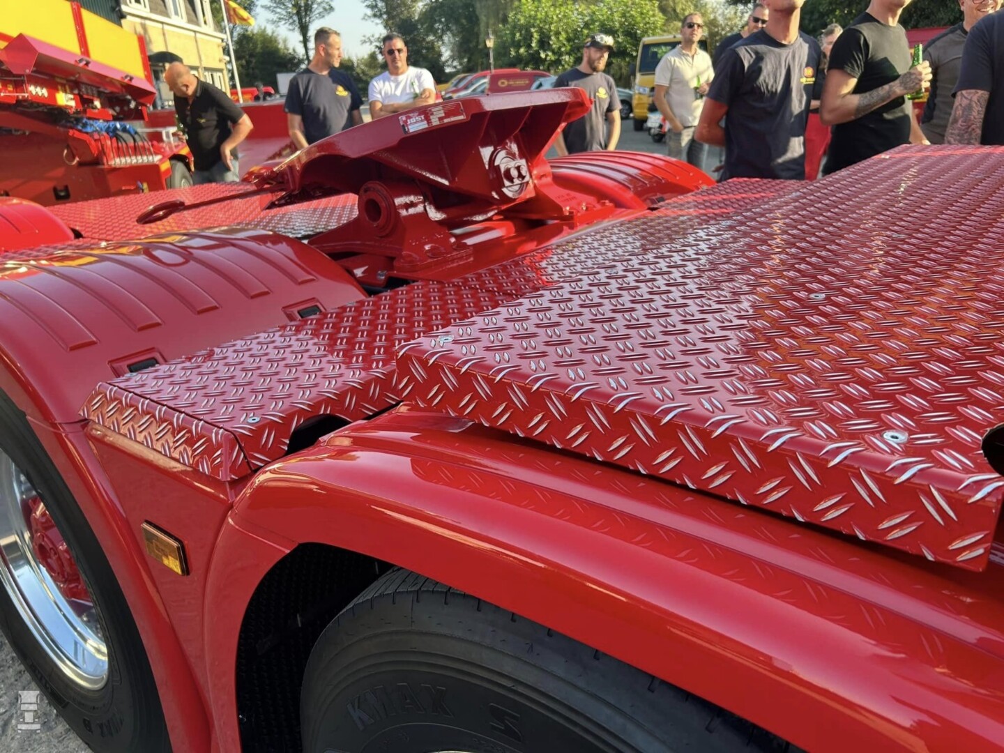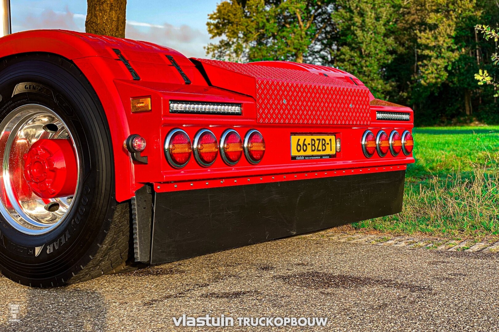 Verder werd er een fraaie kistenwand achter de cabine gemaakt met daarin tanks voor water en brandstof. Ook de luchtketels vonden hier een plek. Naast die kastenwand staan twee stoere staande uitlaten. Het hele chassis werd voorzien van een vlonder met opstap laddertjes, er werden 'strings' aangebracht tussen de assen en de trekker kreeg een hydrauliek installatie. Ook de achterbumper werd geheel op maat gemaakt.