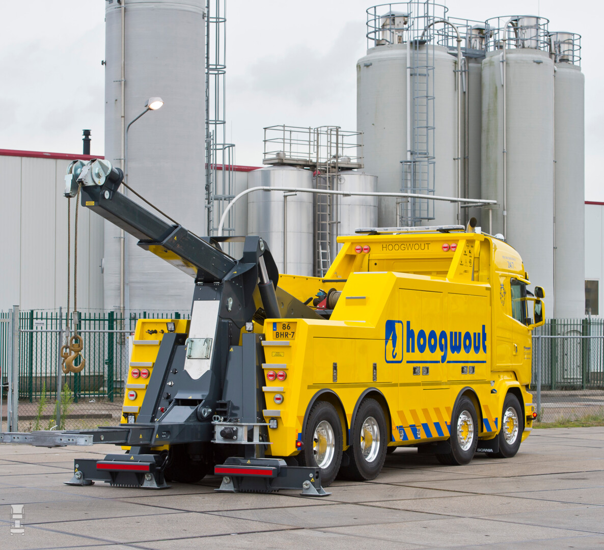 Het werd dus een rondom luchtgeveerde Scania R730 LB 8x4 HNB met een Highline cabine. “Die vier assen hebben we nodig in verband met de maximum aslasten. Door de auto zo compact mogelijk te bouwen, draait hij nu dankzij zijn twee sturende voorassen bijzonder kort. En dat is wat wij goed kunnen gebruiken tijdens een berging.”