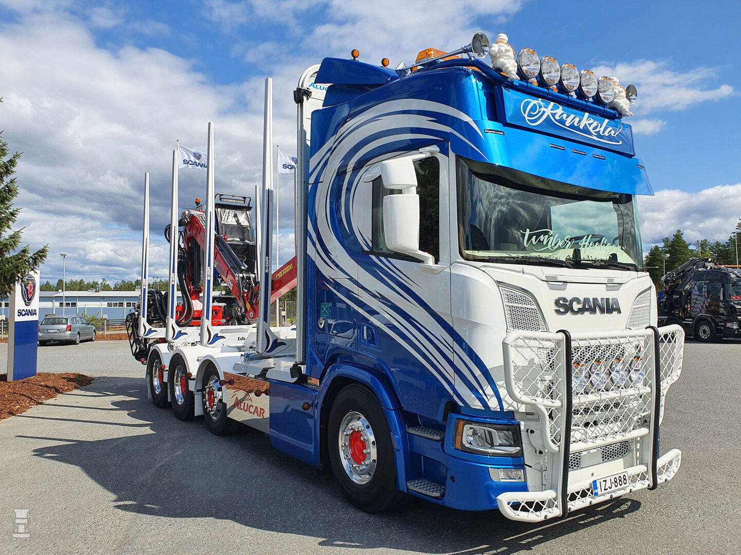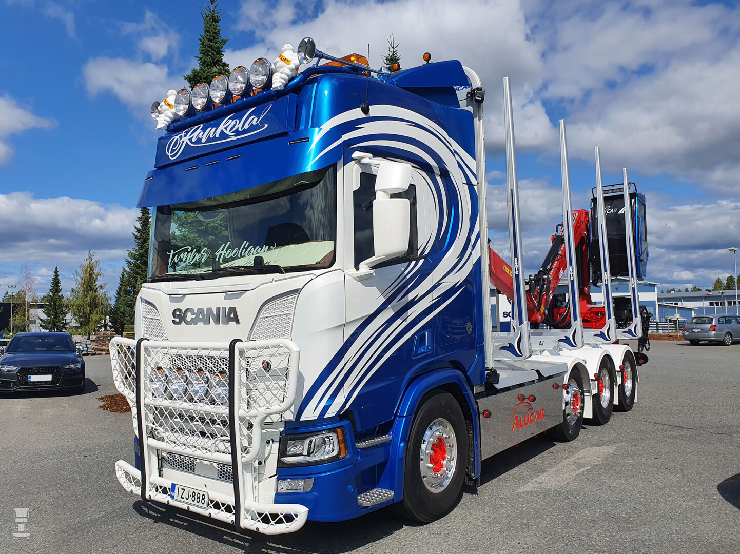 De Finnen hebben een traditie in het mooi uitdossen van hun trucks, zo ook deze nieuwe houtauto. De Scania R770 Highline werd rijkelijk voorzien van opties en fraai spuitwerk maar hoe hou je dit netjes?