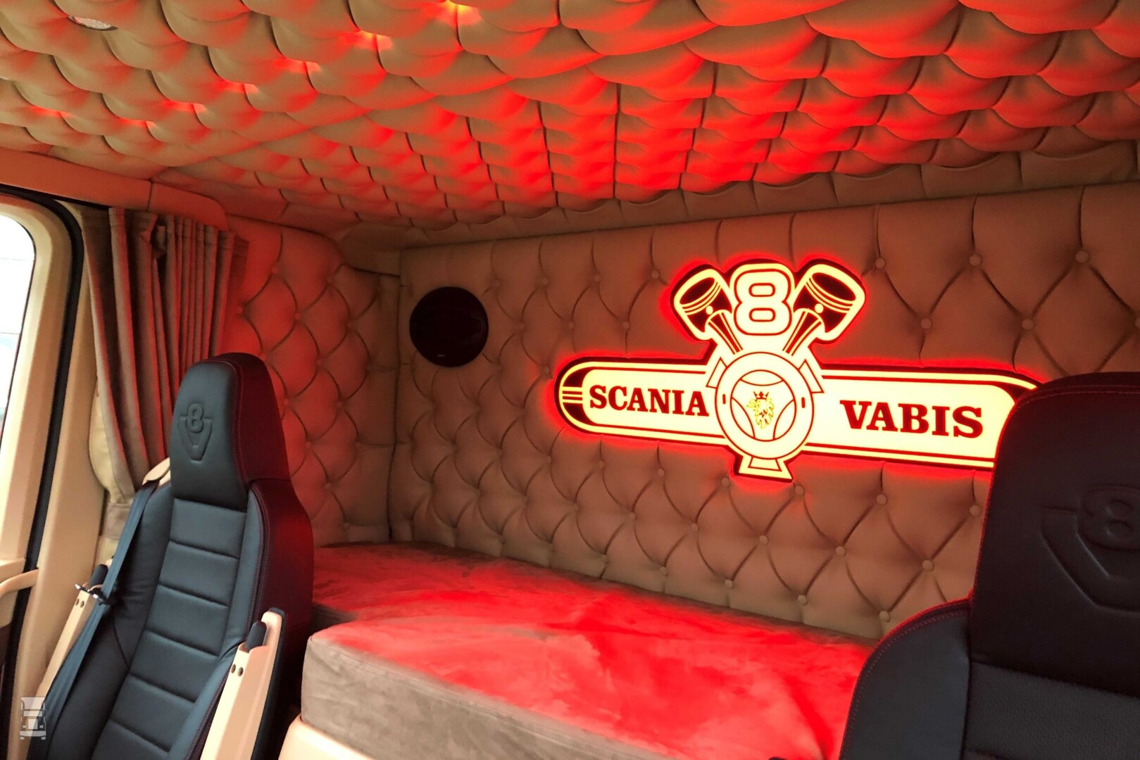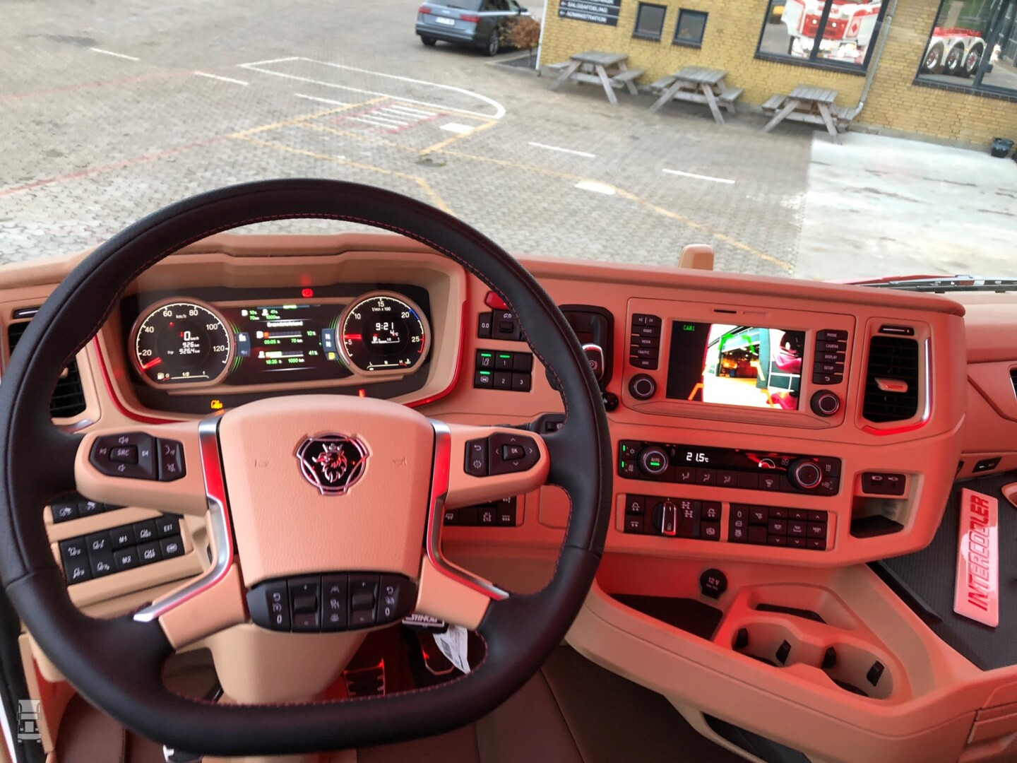 Aksel over zijn nieuwe gereedschap: ,,Ik heb gekozen voor een ‘Old-Skool’ look voor deze truck. Met een lage cabine en een slaapcabine met plat dak, compleet met een rekje, een originele Deense lichtbak en een Scania 3-serie Streamline zonneklep’’. De truck werd gespoten door OJ Autolak in Odense, waarna FL Buur in Vrå het interieur aanpakte. Daarbij werden alle kunststof delen gespoten, maar het originele stuur met alle schakelaars bleef op zijn plek. Verder werd het interieur voorzien van noppen bekleding met LED verlichting en een mooi verlicht paneel tegen de achterwand.