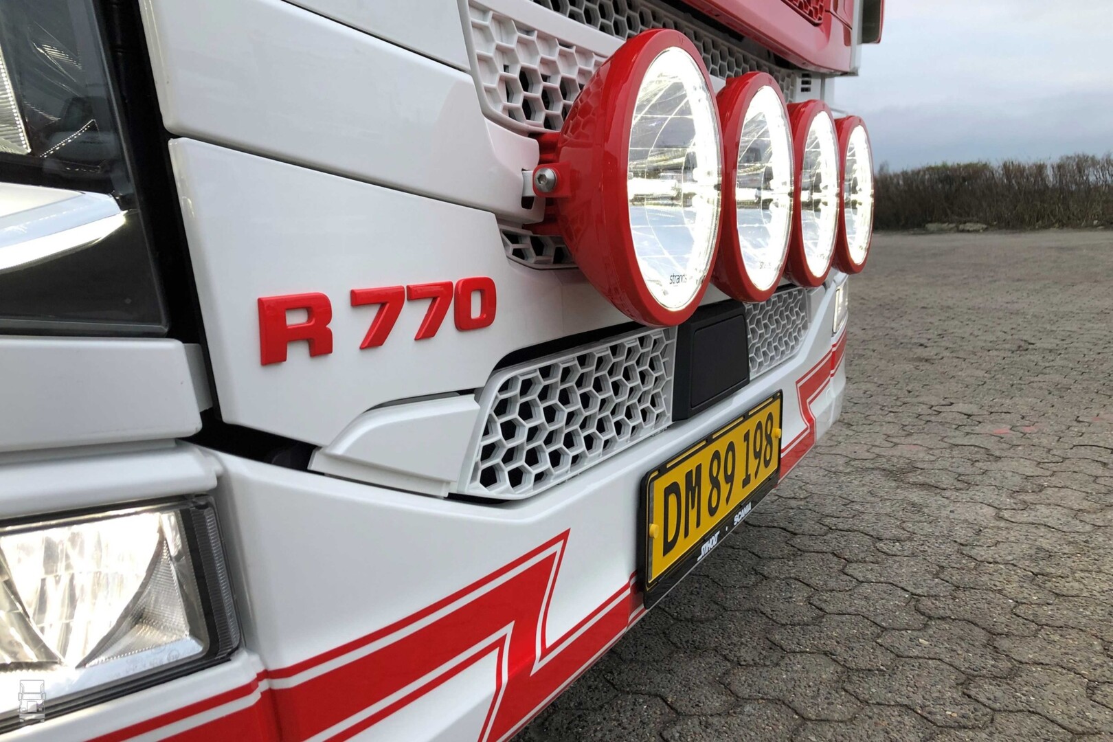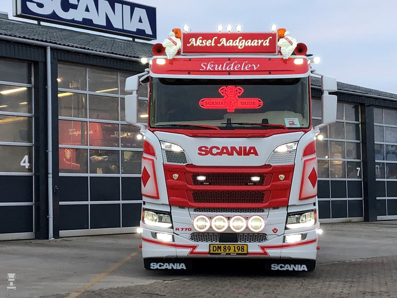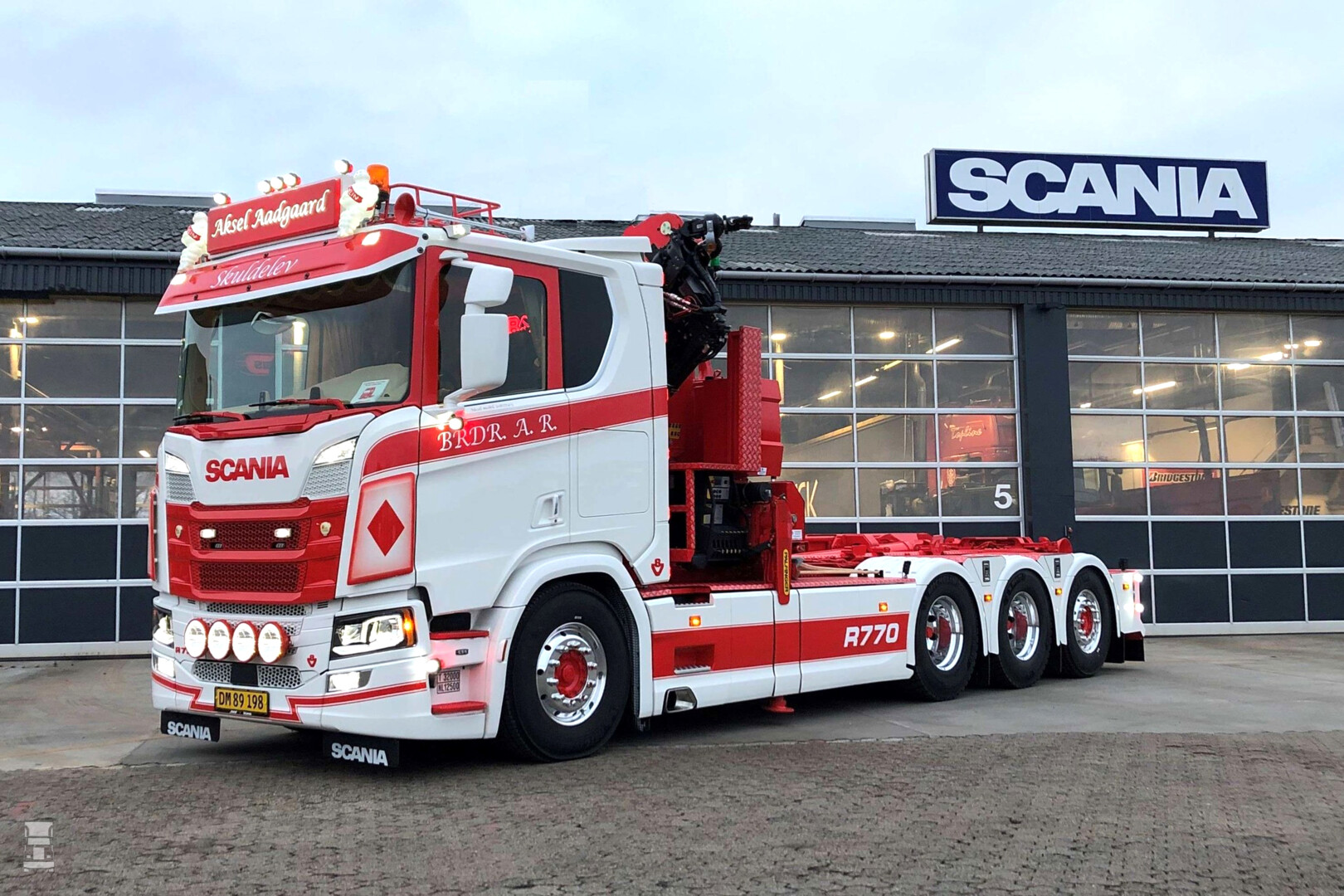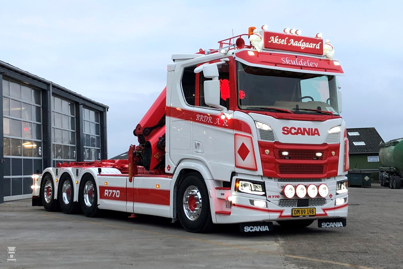 De truck rijdt voor Aksel en Rasmus Aadgaard uit Skuldelev, een dorpje links boven Kopenhagen. Het bedrijf heeft zes trucks op de weg. De Scania werd geheel in Deense stijl opgebouwd en afgewerkt door Funs Karrosseribyg in Odense. Daar werden ook de Palfinger autolaadkraan en het Meiller haakarm systeem opgebouwd. De Scania R770 B8x4*4 werd geleverd door Stiholt in Thisted, op Noord Jutland.