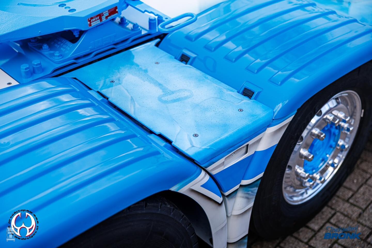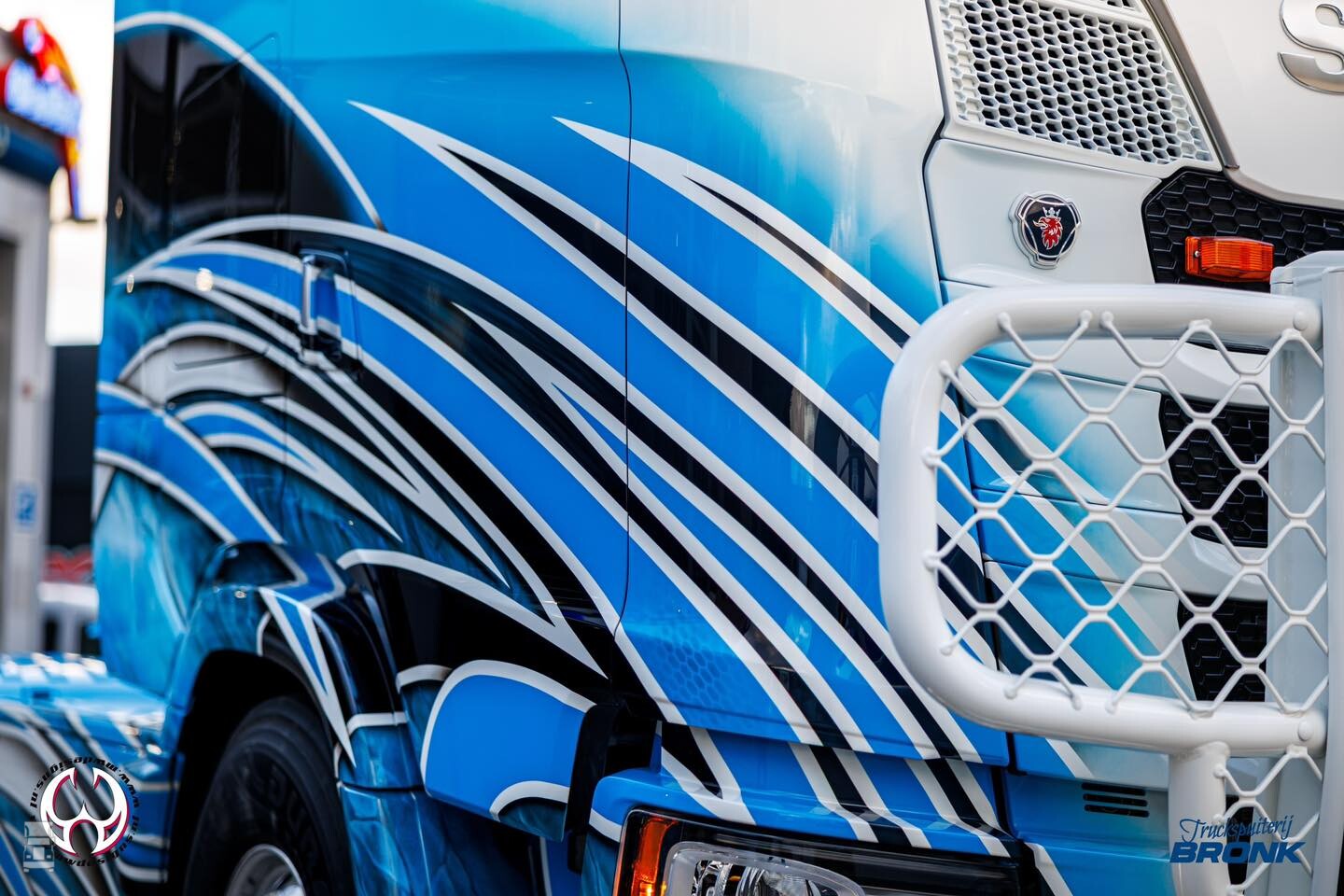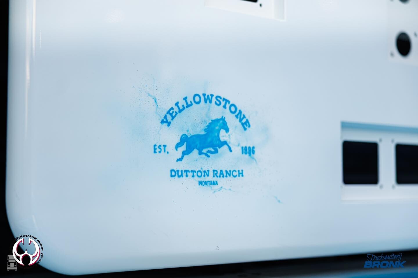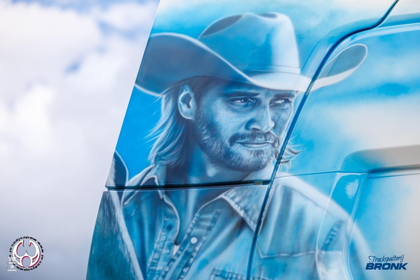 De Scania werd opgebouwd door TSW-Truckstyling met onder meer een bullbar, een stoere lichtbak en een verlengde zonneklep. Ronduit spectaculair is het spuitwerk, met veel lijntjes die overal keurig doorlopen. Ook als je de deuren open doet loopt het lijnenspel door, ook aan de binnenkant van de deuren. Best ingewikkeld met al die rondingen en het aantal lijnen. Ook het special paint werk is bijzonder fraai geworden, met stoere cowboy's uit de serie Yellowstone. Eigenlijk is het enige wat mist aan deze truck een TIA Cowboy Club lichtbakje!