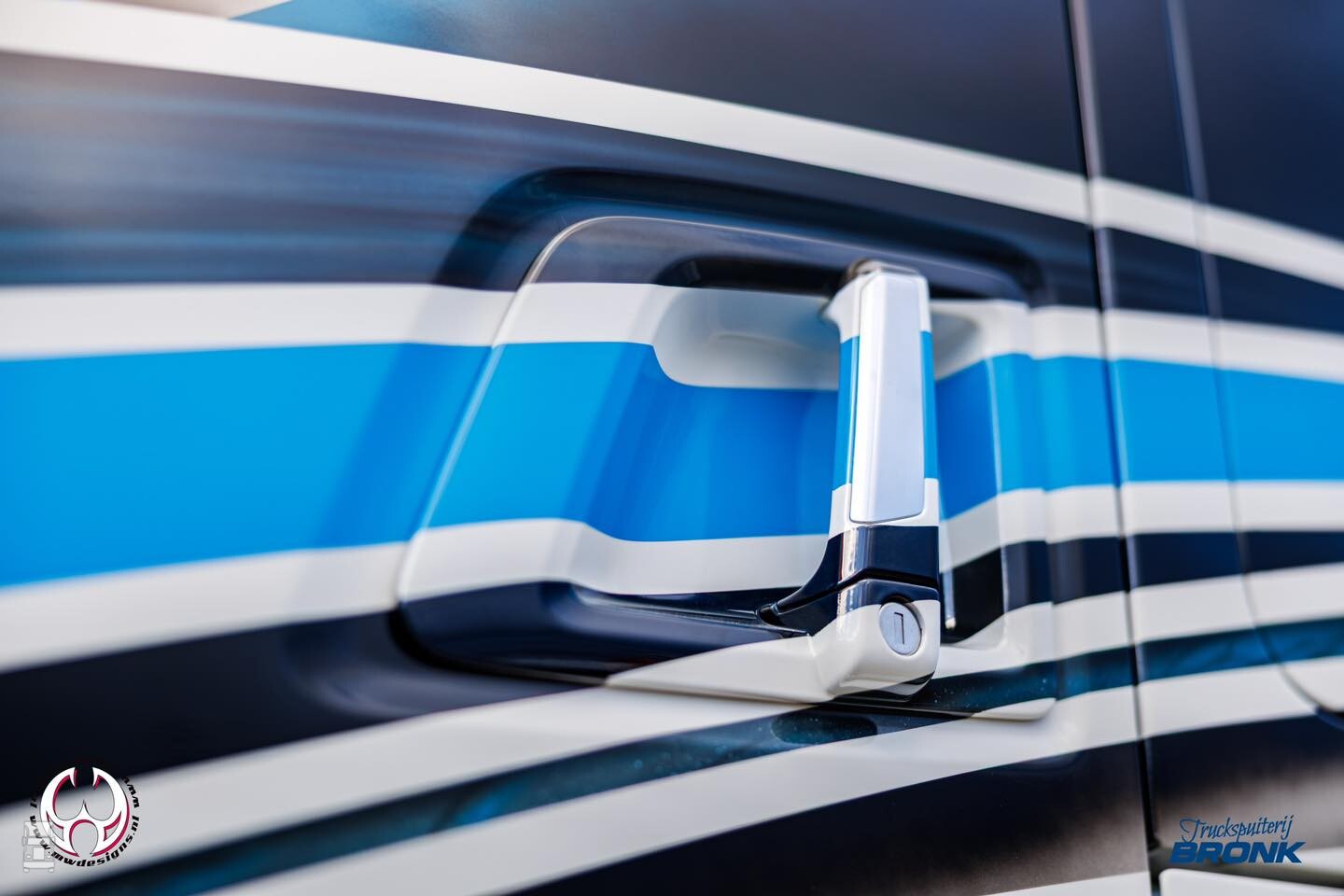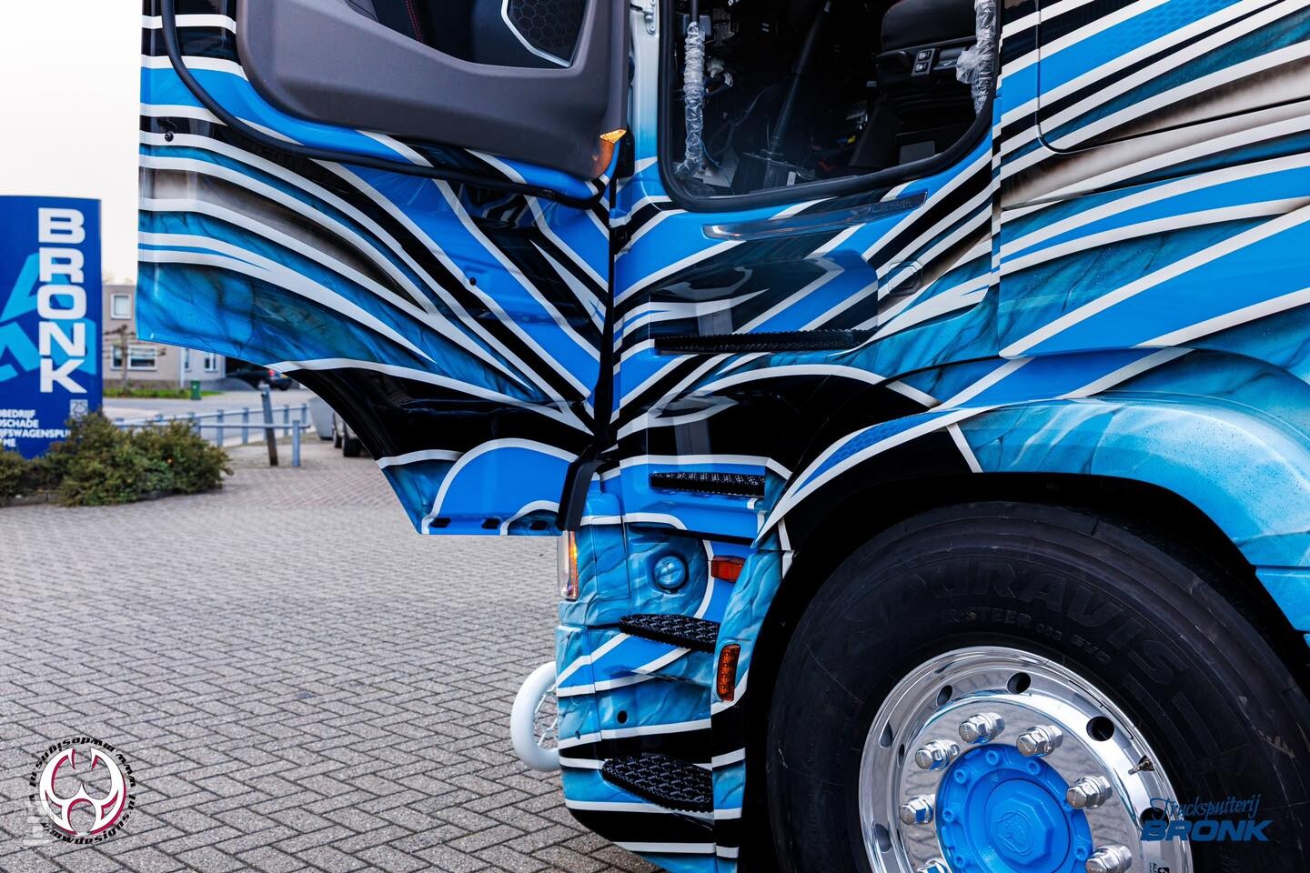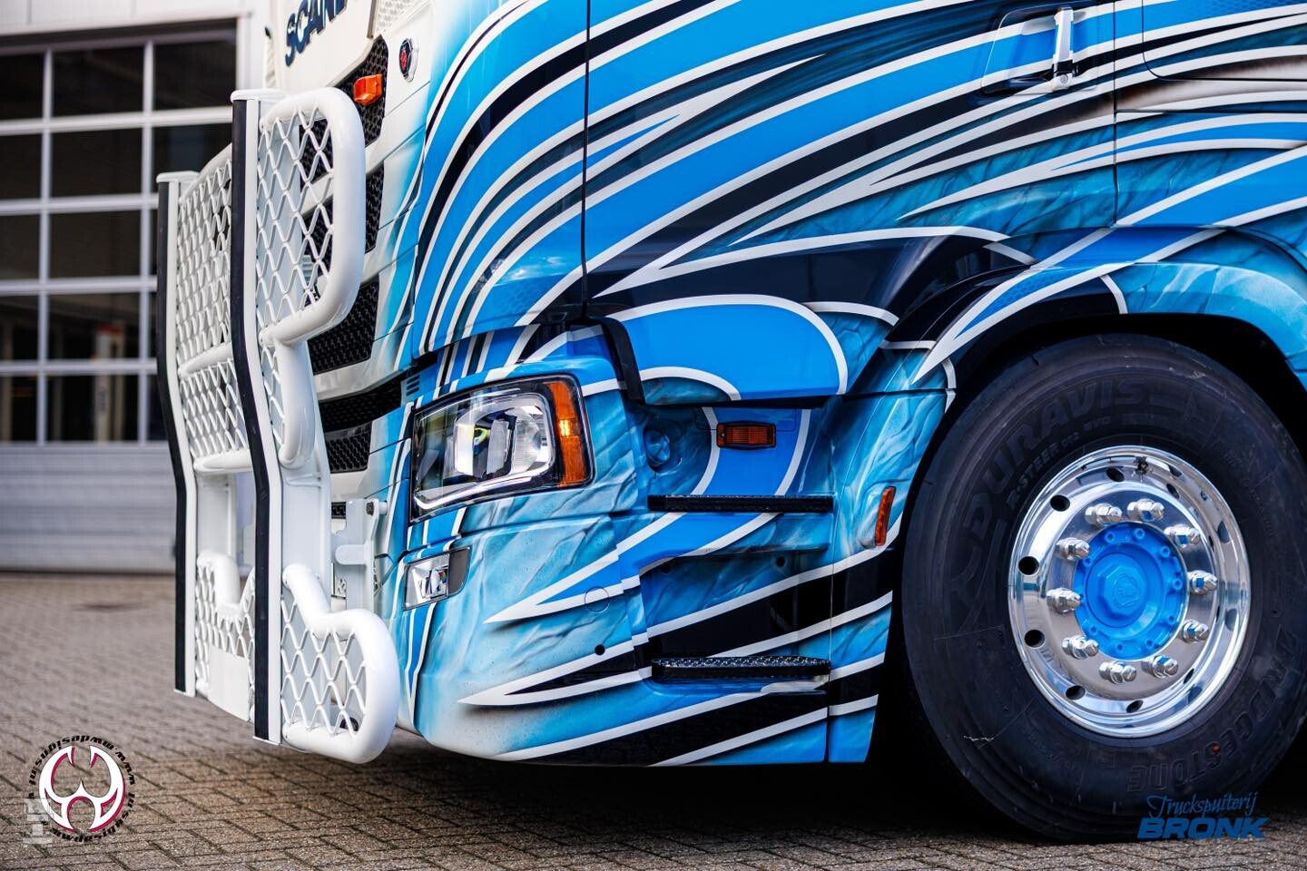 De Scania werd opgebouwd door TSW-Truckstyling met onder meer een bullbar, een stoere lichtbak en een verlengde zonneklep. Ronduit spectaculair is het spuitwerk, met veel lijntjes die overal keurig doorlopen. Ook als je de deuren open doet loopt het lijnenspel door, ook aan de binnenkant van de deuren. Best ingewikkeld met al die rondingen en het aantal lijnen. Ook het special paint werk is bijzonder fraai geworden, met stoere cowboy's uit de serie Yellowstone. Eigenlijk is het enige wat mist aan deze truck een TIA Cowboy Club lichtbakje!