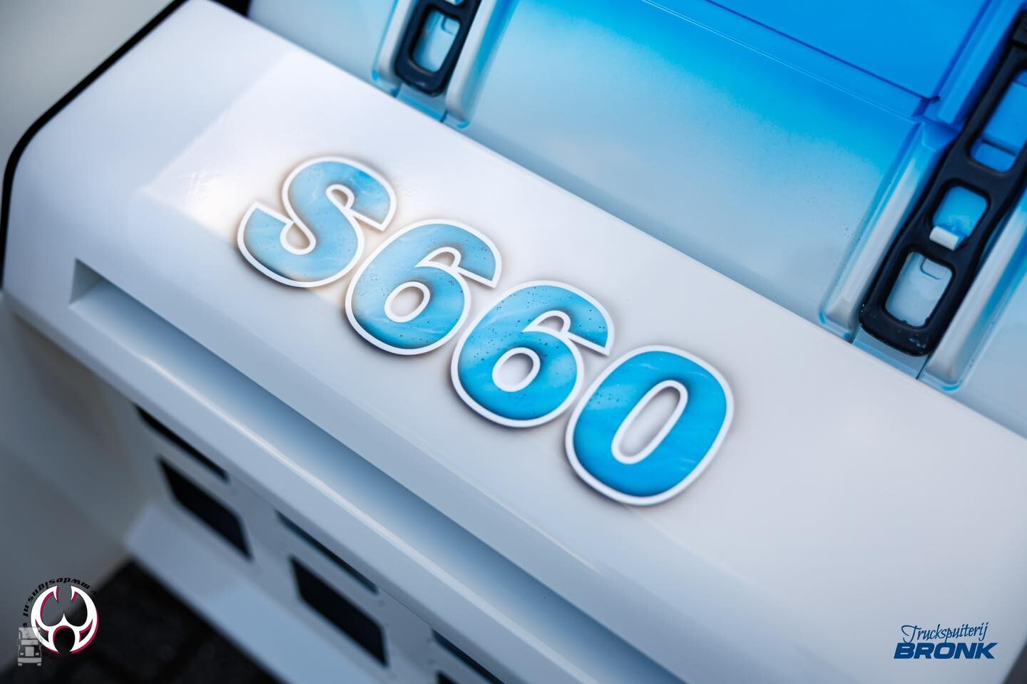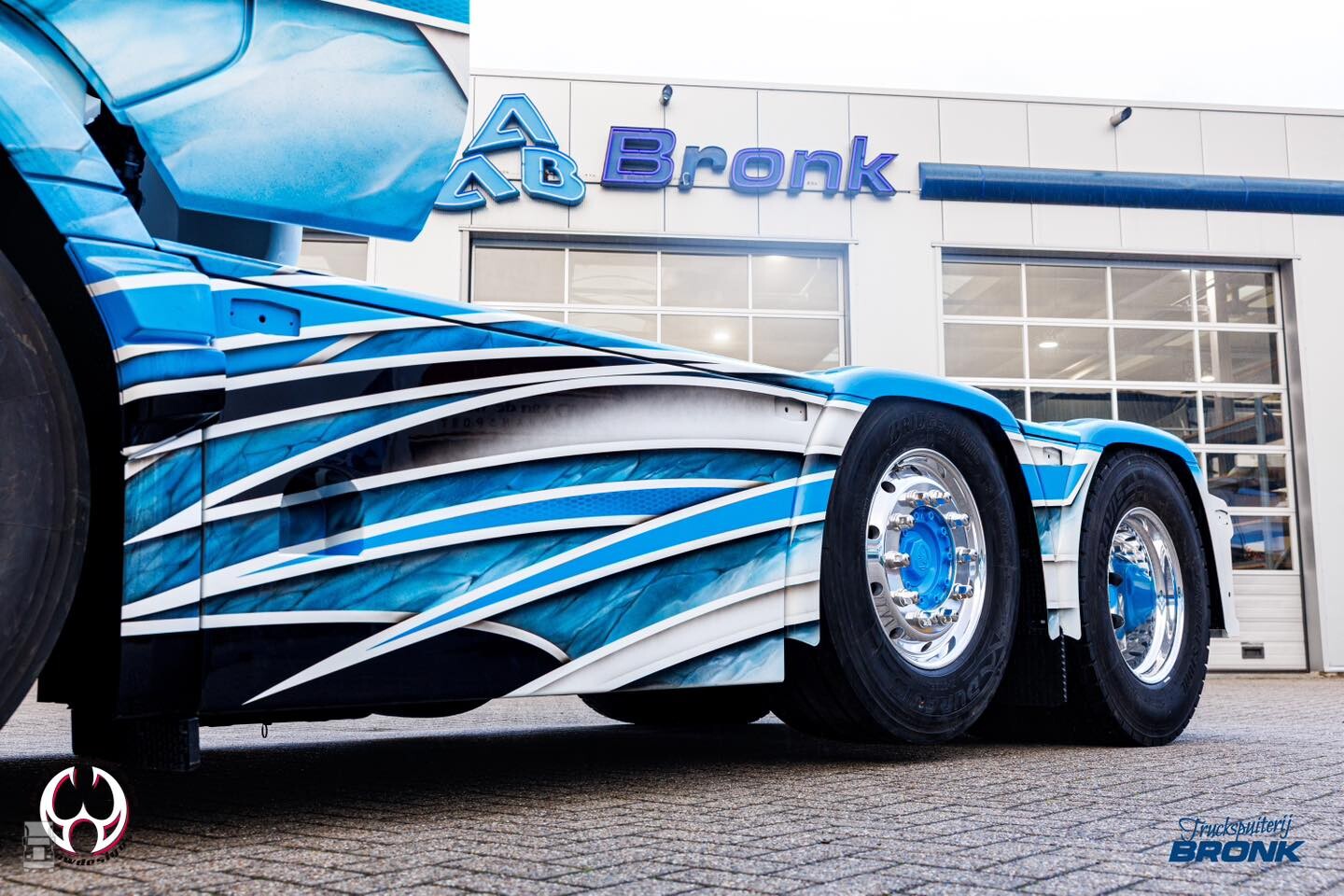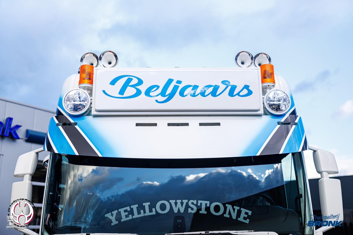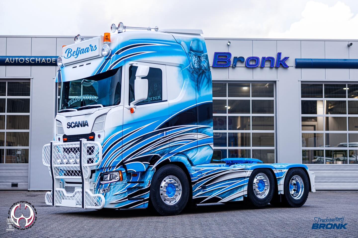 De Scania werd opgebouwd door TSW-Truckstyling met onder meer een bullbar, een stoere lichtbak en een verlengde zonneklep. Ronduit spectaculair is het spuitwerk, met veel lijntjes die overal keurig doorlopen. Ook als je de deuren open doet loopt het lijnenspel door, ook aan de binnenkant van de deuren. Best ingewikkeld met al die rondingen en het aantal lijnen. Ook het special paint werk is bijzonder fraai geworden, met stoere cowboy's uit de serie Yellowstone. Eigenlijk is het enige wat mist aan deze truck een TIA Cowboy Club lichtbakje!