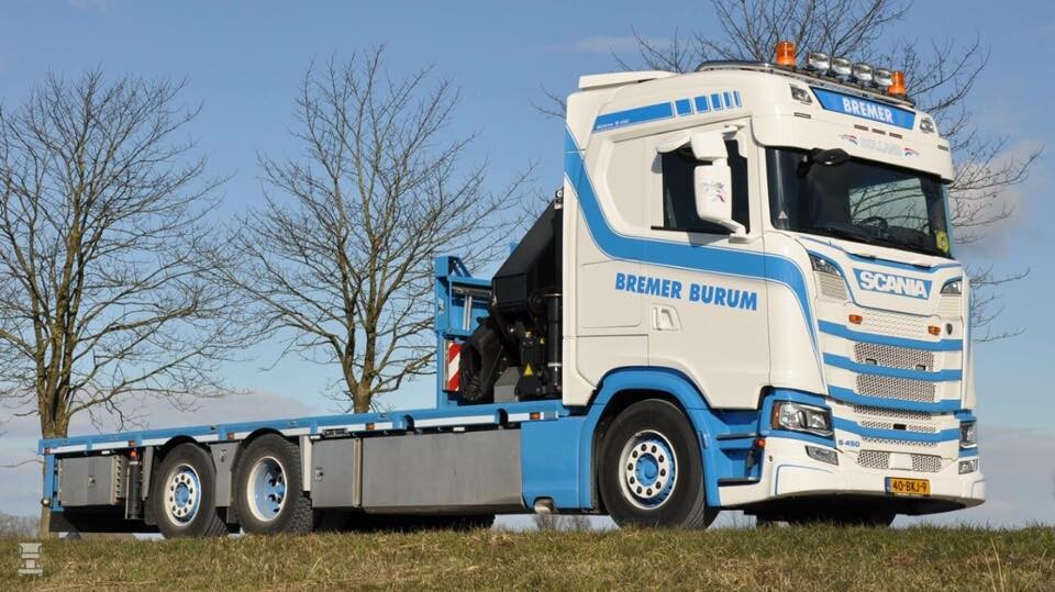 Transportbedrijf Bremer uit Burum heeft een fraaie Scania S450 met een zware HMF autolaadkraan in gebruik genomen. De strakke wit- blauwe huisstijl van Bremer staat de nieuwe Scania generatie bijzonder goed. De opbouw van de laadbak en de autolaadkraan werden gedaan door CCH uit Halsteren.