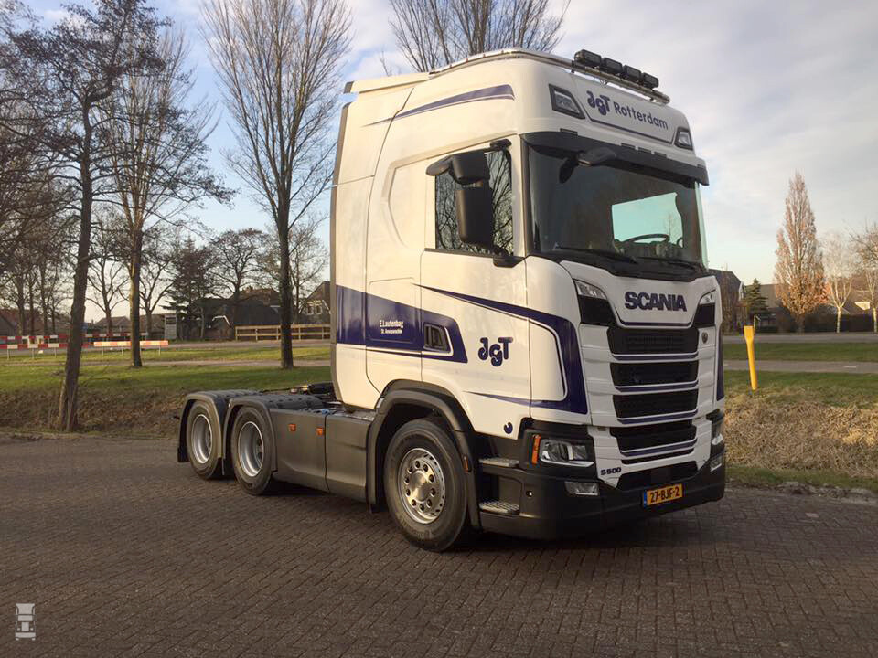 De voorloopas trekker is al de vijfde truck die Eelke en Aliet Lautenbag kochten bij Scania dealer Rinsma. Een jubileum dus, want de fraaie S500 Highline is inmiddels de vijfde truck. De trekker is uitgevoerd met een sleepas en wordt ingezet in het containertransport. Eelke Lautenbag rijdt voor JGT Rotterdam met een LZV.