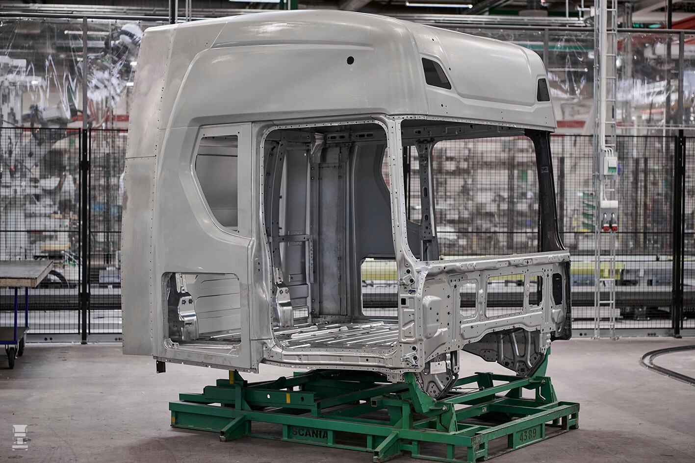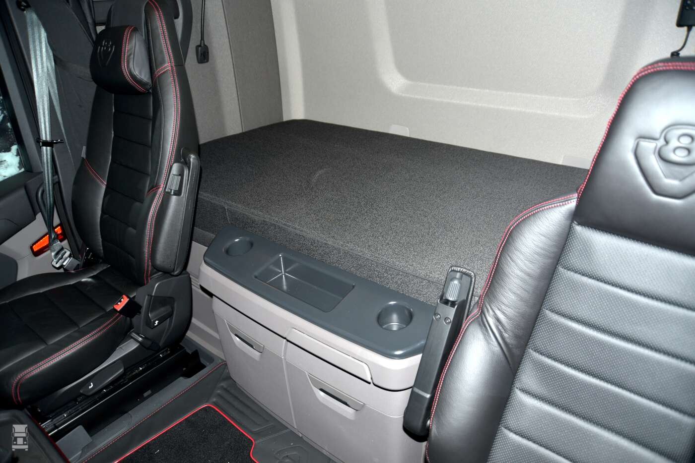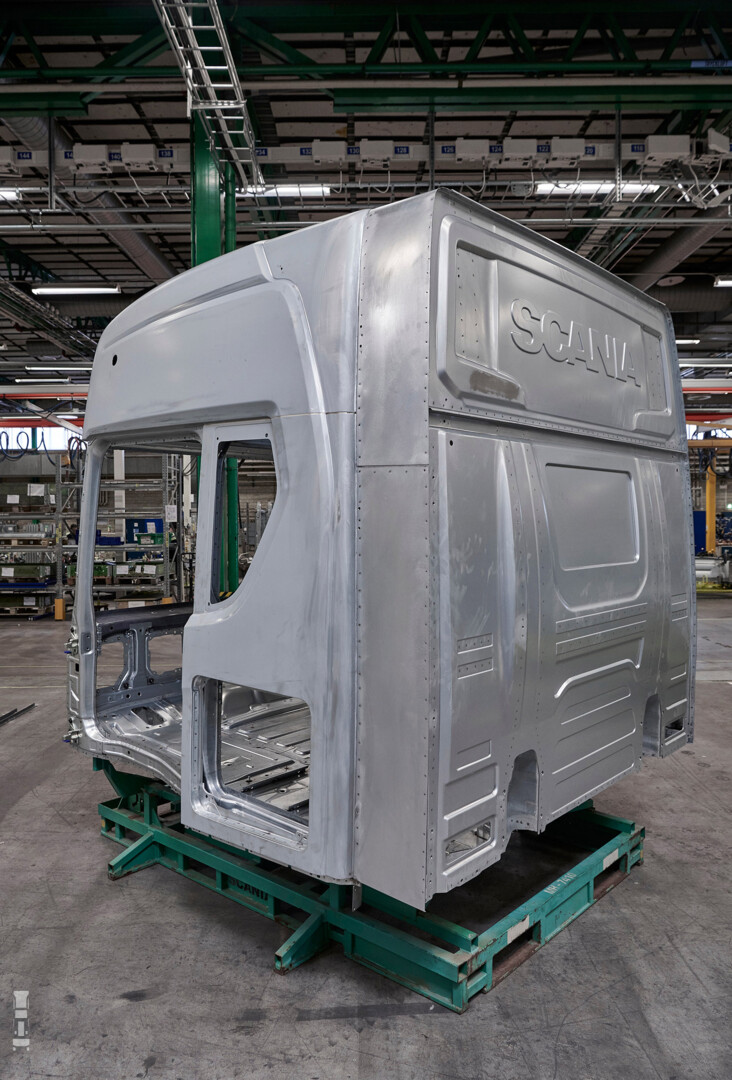 De verlenging van de cabine zit verstopt achter de standaard zijfenders. Daardoor zie je er aan de buitenkant niks van. Die fenders kunnen overigens niet meer open. Dat zou ook weinig zinvol zijn, want daar achter zit het extra stuk blik van de verlenging. Eigenlijk doet Scania hiermee het zelfde als Volvo met de XXL cabine, alleen heeft de Volvo langere zijfenders.