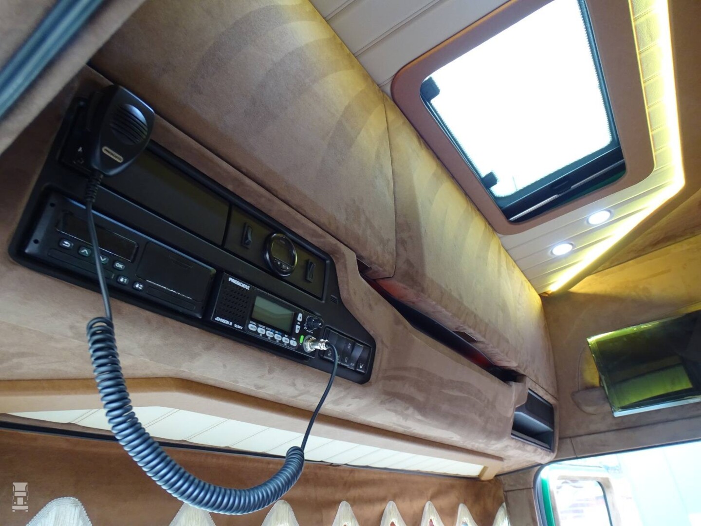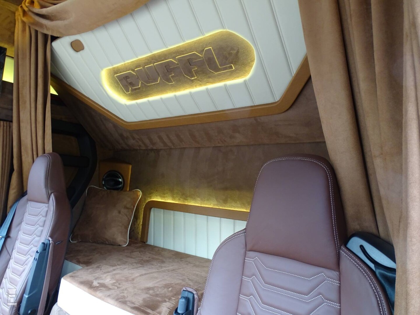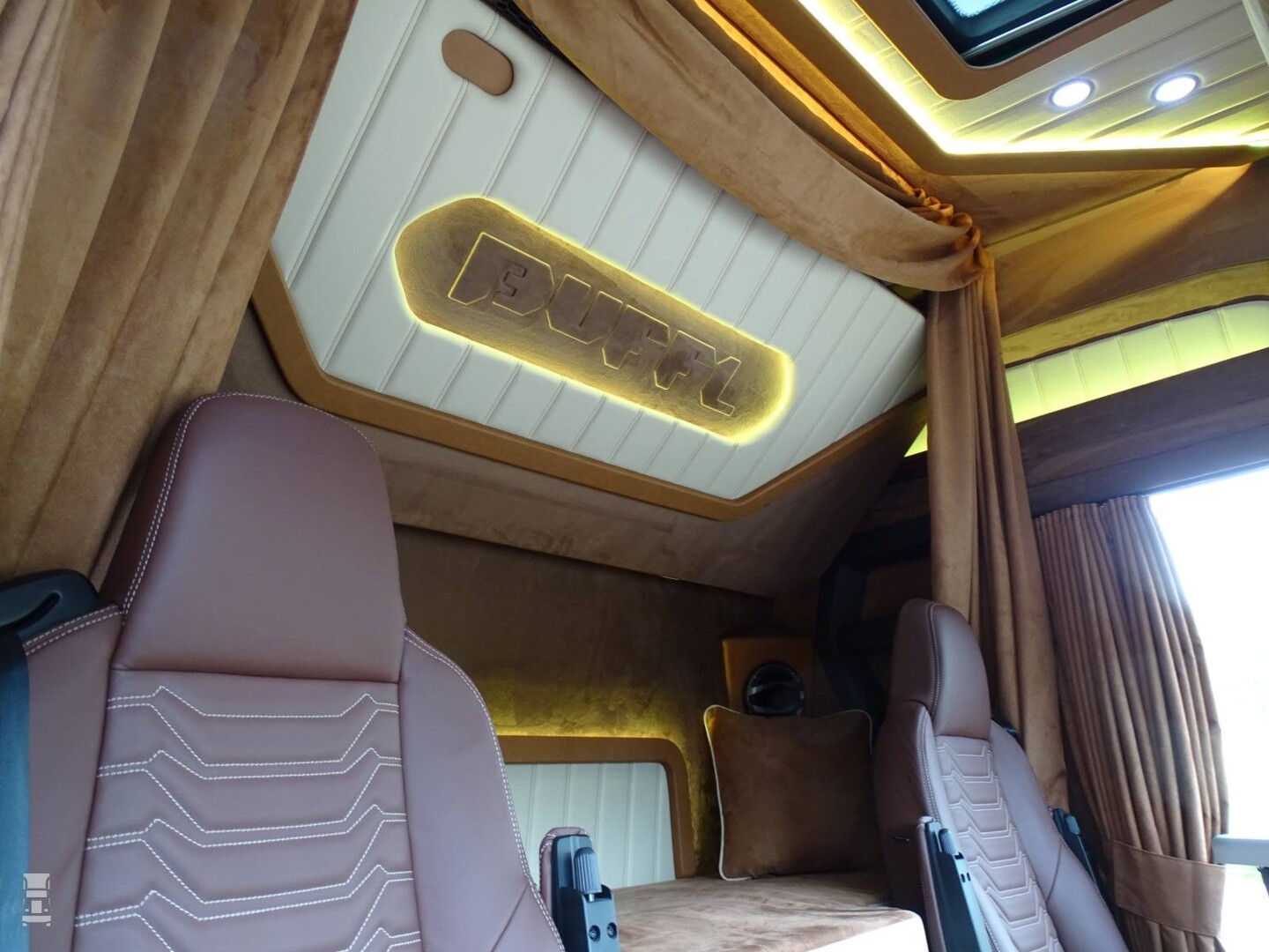 De Scania 560S Highline werd voorzien van een diepere zonneklep, een lichtbak met twee Michelin poppen en de nodige extra verlichting. Het interieur werd verzorgd door Buffl, met smaakvolle bekleding en extra verlichting. Alles is bekleed in deze cabine, zelfs de bovenkastjes zijn voorzien van alcantara stof.
