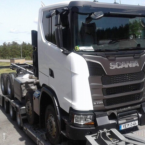 De stoere 8x8 met laag dak is volgens de type aanduiding een S-730. Het is duidelijk aan testvoertuig. De uitlaatdemper ziet er nog niet definitief uit en dat wijst ook in de richting van de geruchten die we hoorden. Verder zien we achter de cabine duidelijk een extra grote luchtfilter. Tot nu toe zat die onder de cabine en zoog de truck aan door de grille.