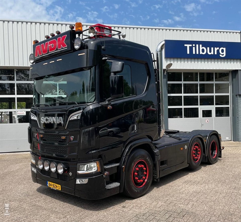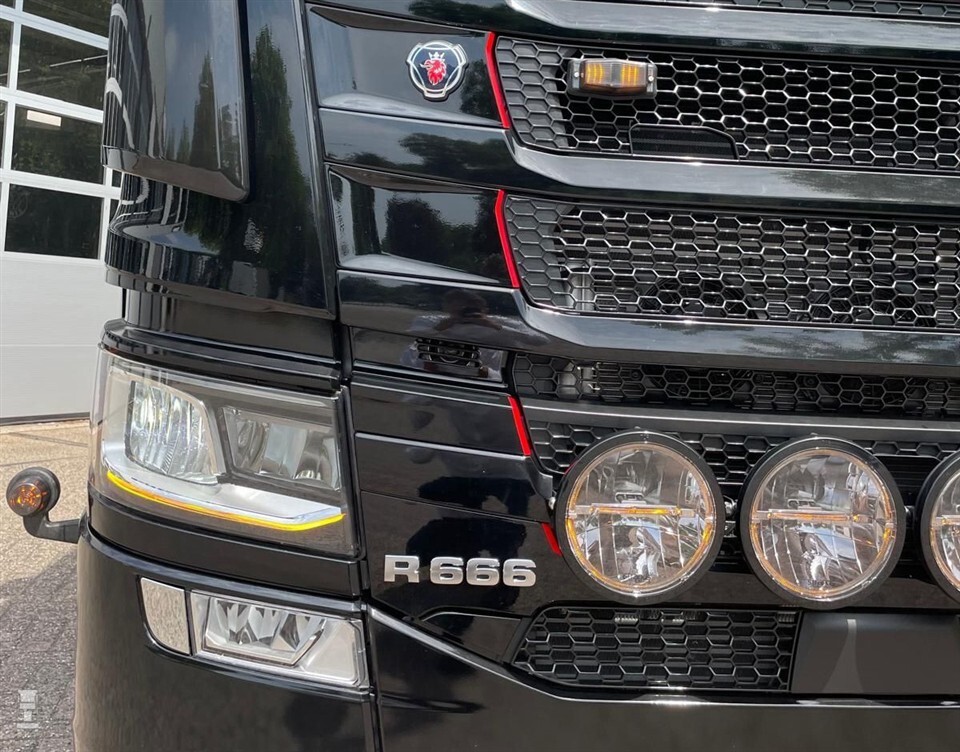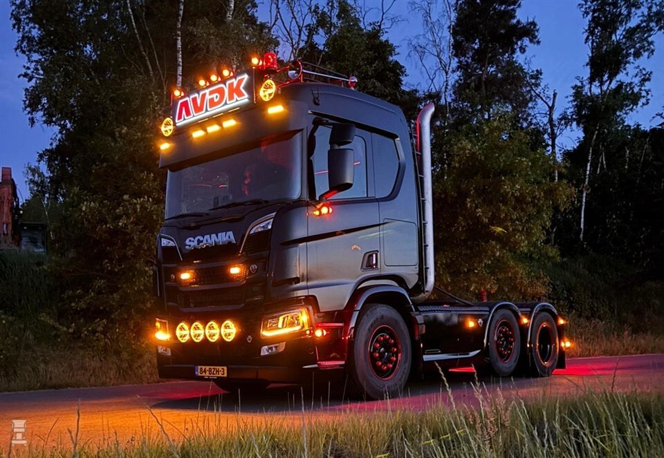Met een bak accessoires en verlichting is deze zwarte Scania in ieder geval een plaatje!
