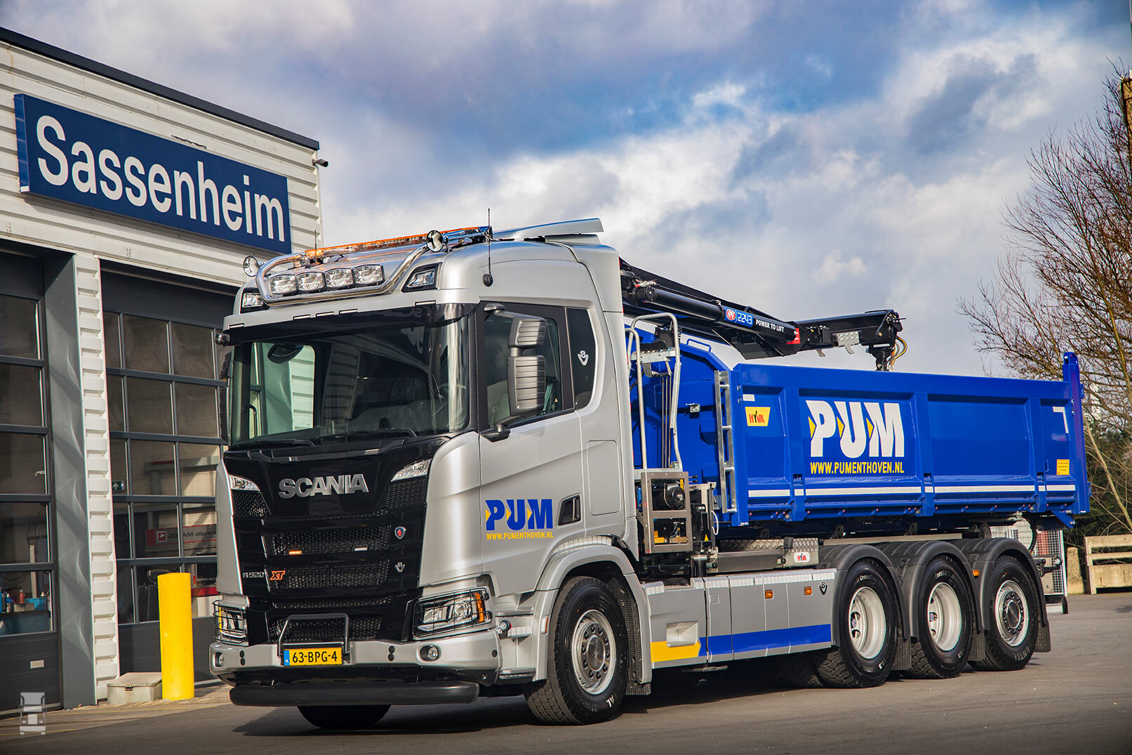 Pum Enthoven uit Lisserbroek nam deze week voor het eerst een Scania in gebruik. De 8x4*4 R520 V8 met een gestuurde naloopas is meteen het paradepaardje van het bedrijf. Hij gaat ingezet worden in de aan- en afvoer van bouw- en sloopmaterialen. Daartoe is de auto uitgerust met een 22t/m HMF cabinekraan en een 26 tons haakarminstallatie van Hyva.