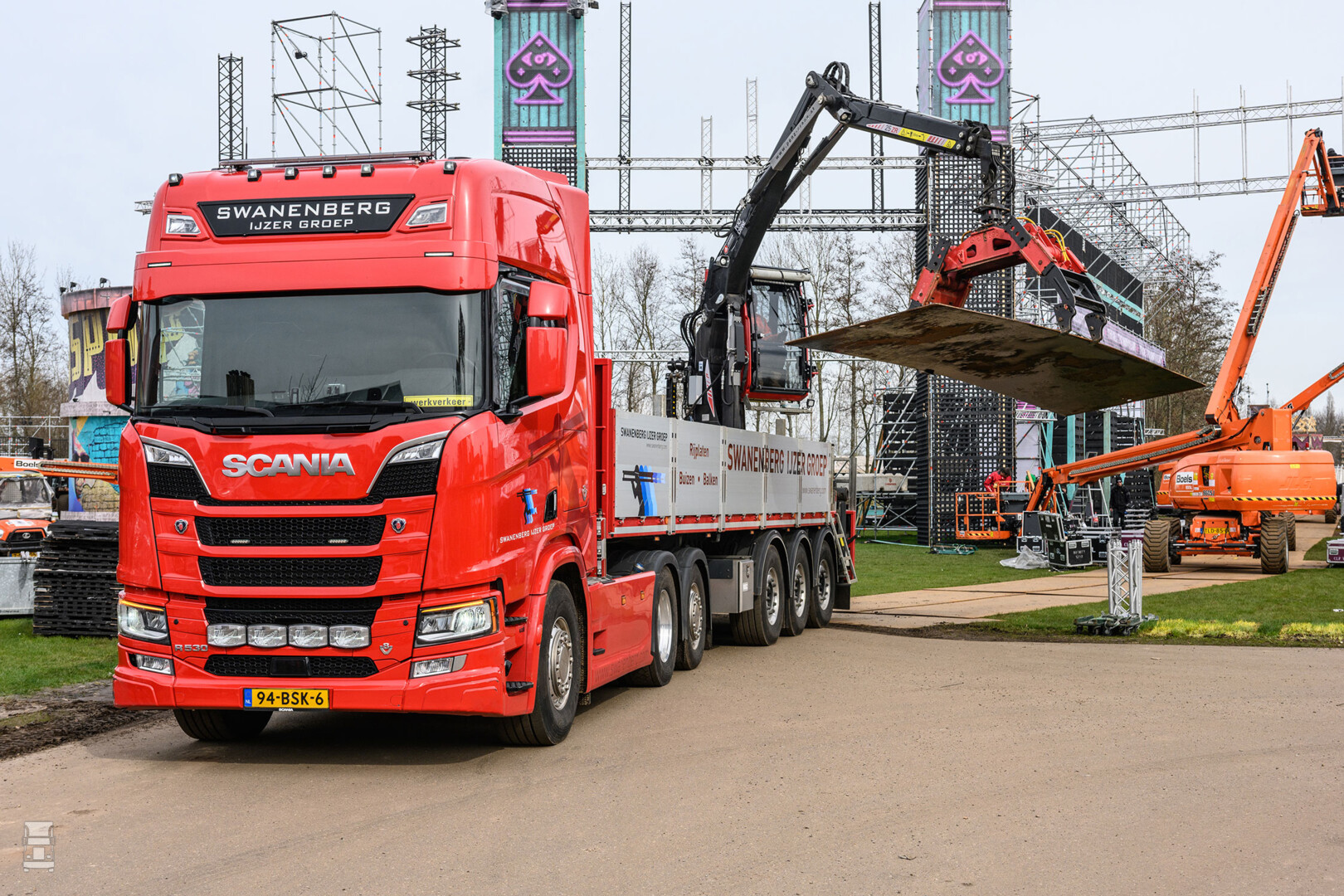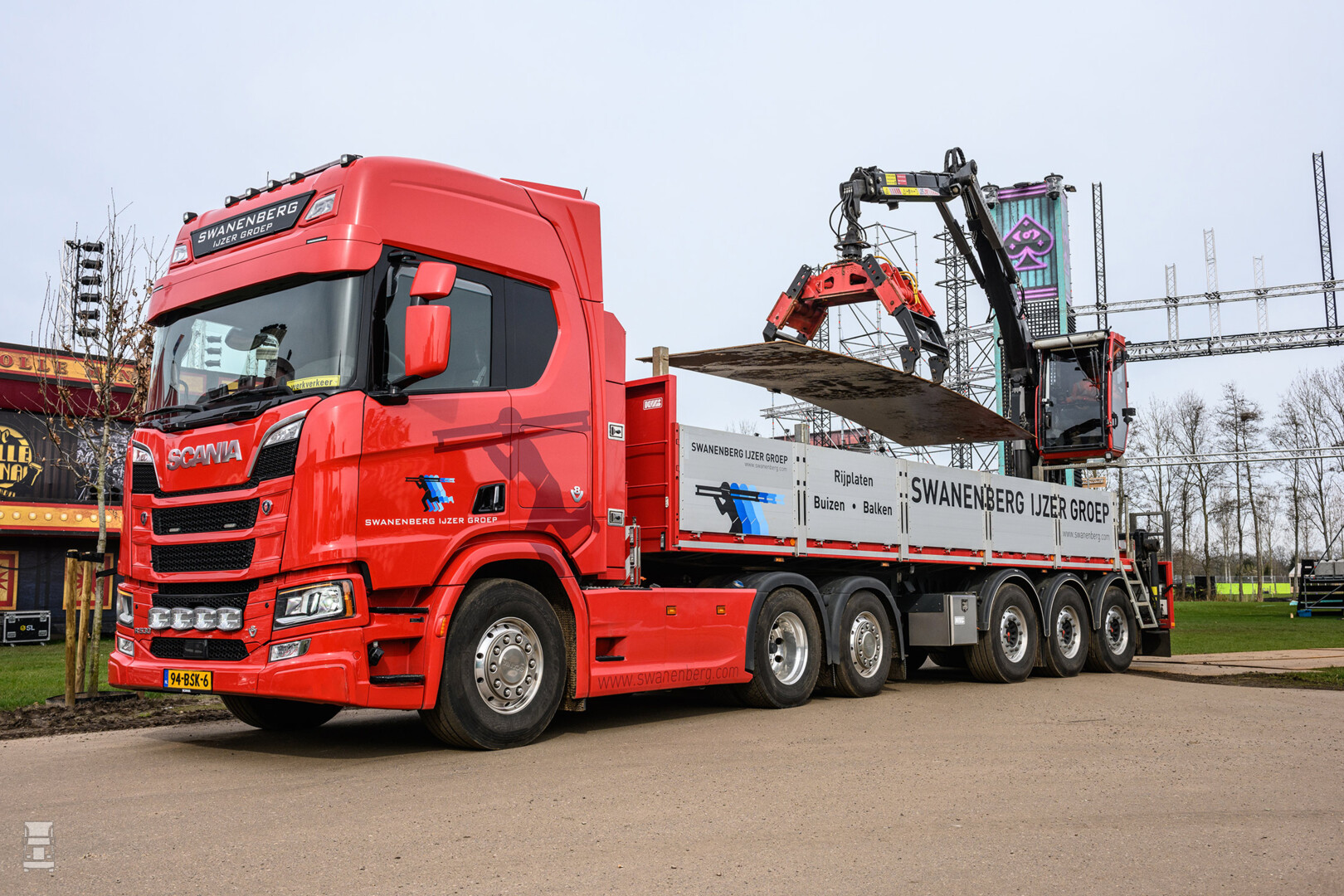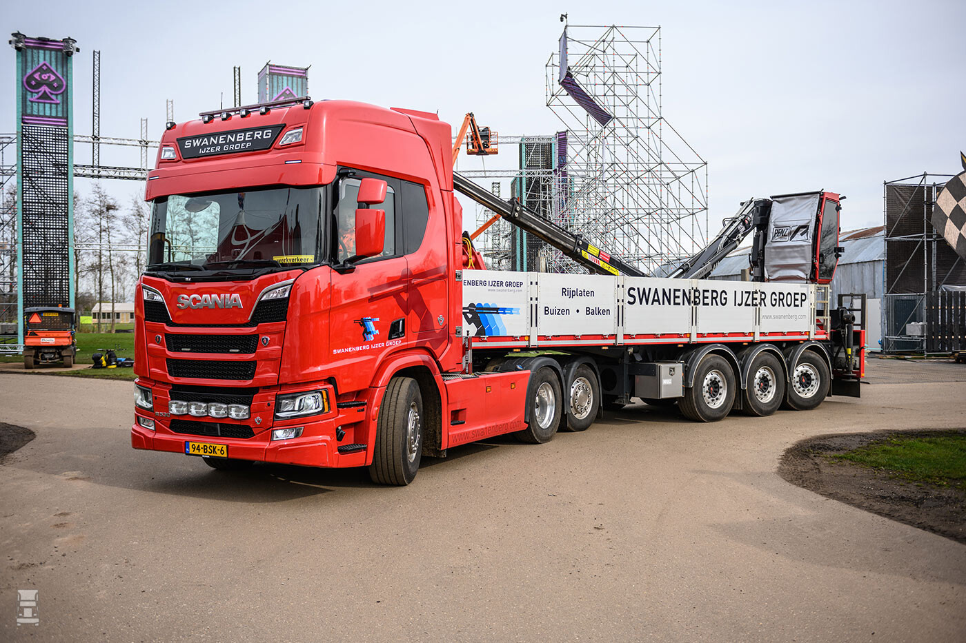 De Swanenberg IJzergroep uit Schaijk is een mondiaal opererend bedrijf dat stalen buizen produceert en handelt in damwanden, stalen lengteprofielen en plaatstaal. Een aparte tak is het leggen van stalen en kunststof rijplaten. Het bedrijf maakt zo bijvoorbeeld locaties voor de weg- en waterbouw en grote projecten toegankelijk voor zwaar verkeer. Ook heeft het een goede naam in de festivalwereld en grote buiten evenementen waar ook veel rijplaten gebruikt worden. “Ons werk bestaat voor een deel uit intern transport van materiaal tussen de vestigingen en voor een ander deel uit de aflevering van onze producten bij klanten op bouwlocaties en festivalterreinen. Dat doen we grotendeels met eigen trucks en verder hebben we een aantal vaste partners die voor ons rijden. Met deze Scania V8 erbij hebben we nu zes voertuigen waarvan de helft Scania. Maar dat gaat weer veranderen. Want inmiddels hebben we nog weer twee nieuwe Scania’s besteld die tegen het einde van dit jaar geleverd moeten worden”, vertelt Directeur Swanenberg’s IJzer Adriaan Keijzer.
