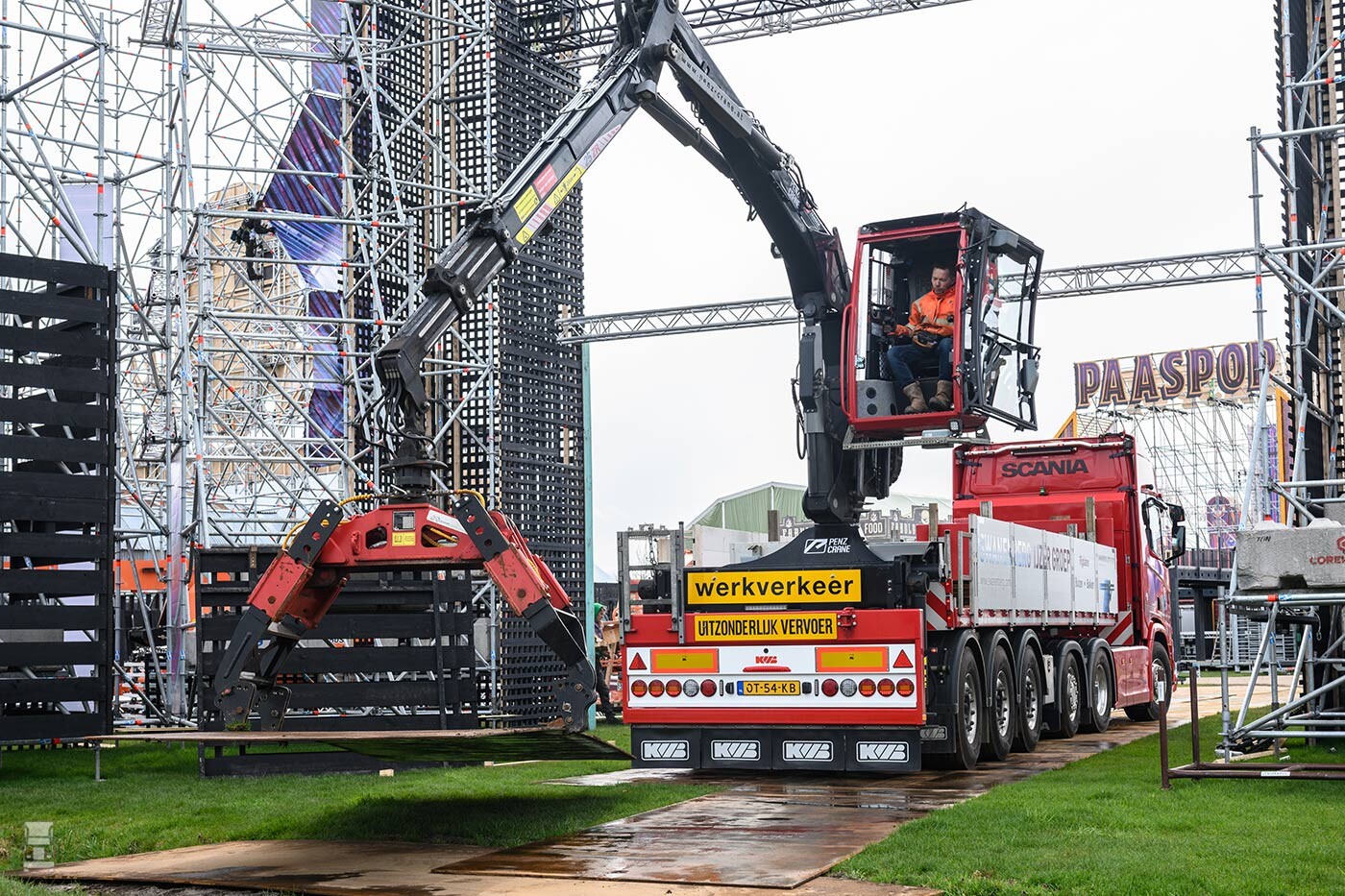 De nieuwe Scania R530 met een hoog cabinedak is helemaal dedicated voor het leggen van rijplaten. De auto heeft zelf een gestuurde en hefbare naloopas, maar ook de nieuwe KWB-trailer heeft sturende assen. “We hebben geprobeerd het hele span zo kort mogelijk te houden zodat wij de beste manoeuvreerbaarheid behouden. Want hoewel je de rijplaten normaal gesproken recht achter elkaar legt, moet je aan het eind de auto toch weer zo manoeuvreren dat je de volgende baan kunt leggen”, vertelt Keijzer. “Het mooie bij deze auto is, dat Jansen Hydrauliek uit Oss een prachtige radiografische besturing heeft gemaakt. Technisch gezien is dat een hoogstandje want Jansen maakt daarbij grotendeels gebruik van de al op de truck aanwezige installaties. Daarmee kan de chauffeur als hij achterop de KWB trailer in zijn overdekte 25 ton/m Pens kraan zit, de auto via een afstandsbediening helemaal bedienen. Net zoals je een radiografisch modelautootje bestuurt maar dan een van 50 ton. Hij zit dus achterop, pakt met de kraan één of meerdere rijplaten, legt die achter de auto en laat de truck dan weer naar achteren rijden. Zo maakt hij dus zijn eigen weg in het terrein.”