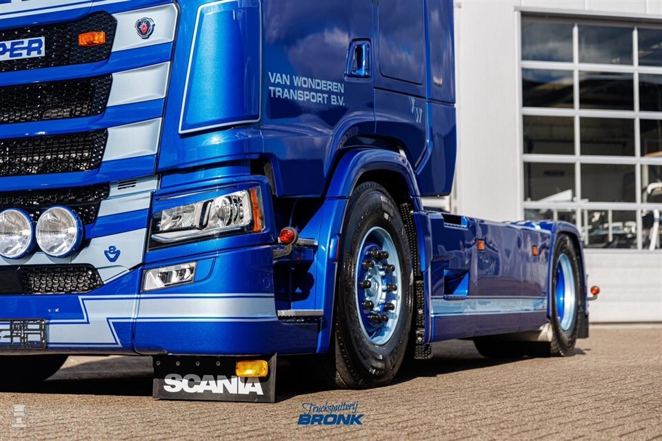 Truckspuiterij Bronk, onderdeel van Barbatruck, voorzag de Scania van een laag indrukwekkend blauwe lak. Met enkele grijsblauwe lijnen is het ontwerp eenvoudig maar klassiek. Uiteraard kreeg de Scania een heleboel accessoires, ook geheel volgens het bekende recept. Vier lampen in de grille, spatlappen en lampen onder de bumper, een lichtbak met twee verstralers en zwaailampen ernaast en twee flinke luchthoorns op het dak. Achter de cabine werd het chassis dichtgemaakt.