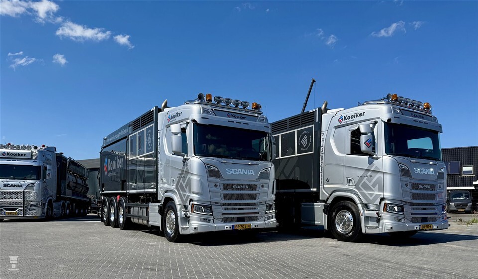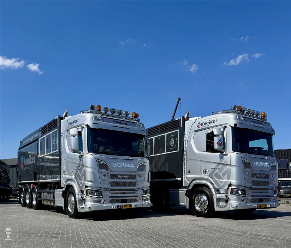 Scania is populair bij Kooiker. De nieuwste aanwinsten vallen dan ook niet uit de toon. Met een 660 pk sterke V8-motor onder de cabine kunnen ze zich meten met de rest. Ook qua opbouw echter, want uiteraard zijn de twee Scania’s gespoten in de nette grijze huiskleur en zijn ze voorzien van de nodige accessoires. Deze zijn door Scania CDW in Zwolle opgebouwd.