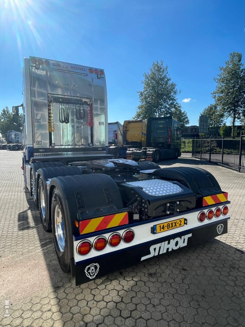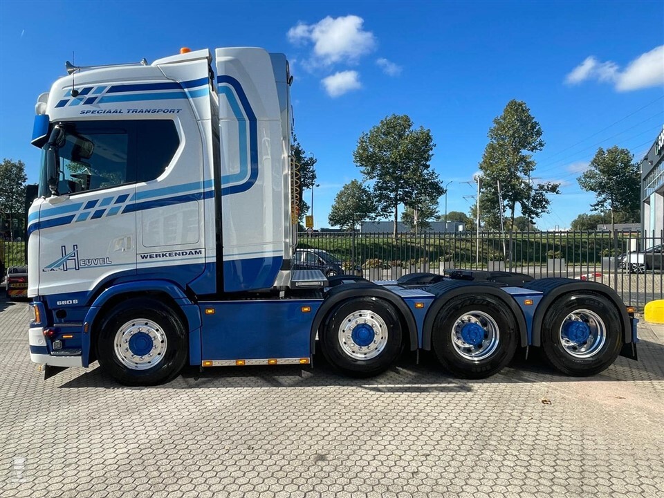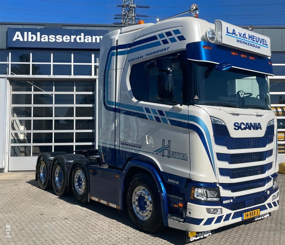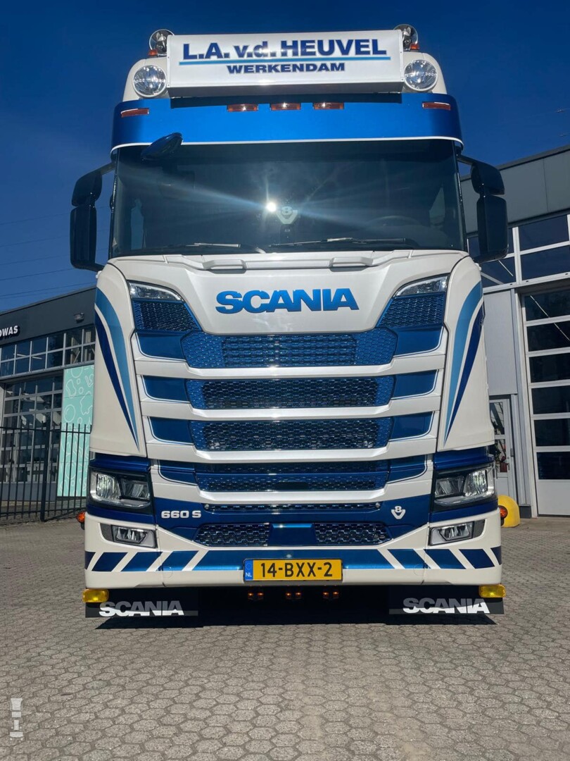 De Scania S660 is wederom gespoten in de klassieke kleuren van Van de Heuvel, die al veel mooie trucks hebben gesierd. Bijzonder is de fraai afgewerkte CCH kistenwand achter de cabine, die mooi is opgenomen in het geheel. De truck is opgebouwd met enkele fraaie accessoires, zonder dat het teveel wordt. Zo zien we luchthoorns, wat verstralers en een lichtbak. De lampen en spatlappen onder de bumper dragen bij aan de oldskool look.