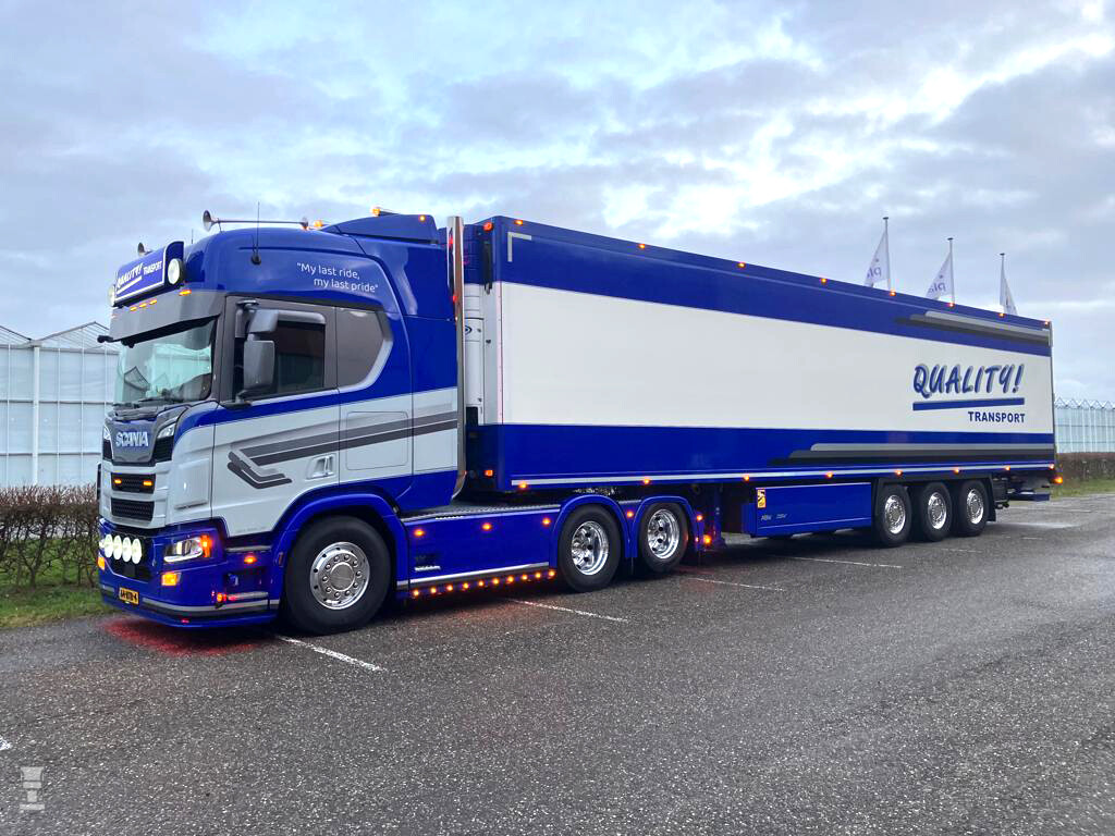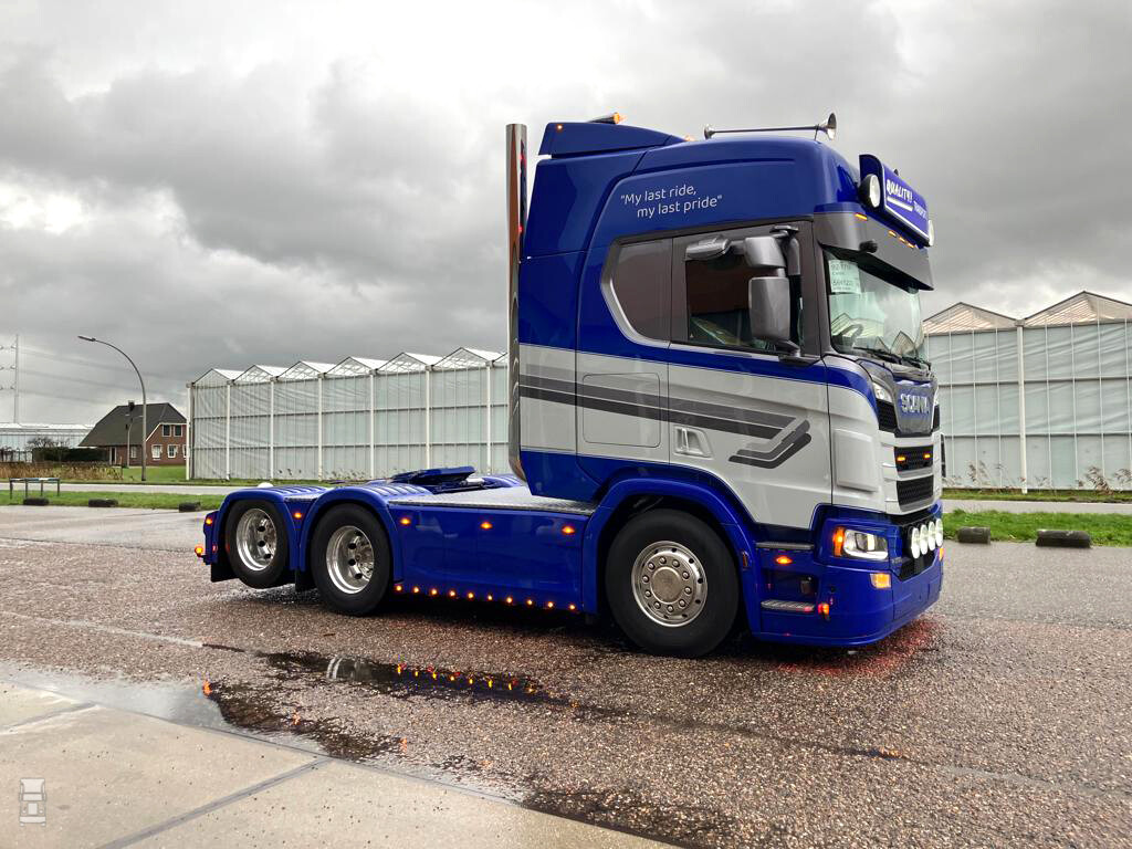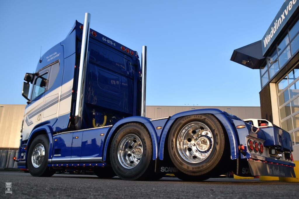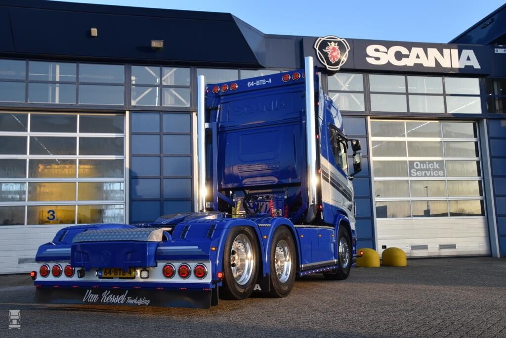 Fred Bijsterveld besloot om zijn nieuwe R590 ook aan te laten passen bij Ematri in Barneveld. ,,Mijn vorige trekker was ook door hun aangepast. Dit is mijn laatste auto en die wilde ik helemaal hebben zoals ik het wilde’’. Niet alleen de cabine werd aangepakt. Van Kessel Truckstyling nam het chassis onder handen met onder meer een nieuwe achterbumper, een fraai slangenrek en twee stoere staande uitlaten achter de cabine. De cabine werd aan de binnenkant volledig bekleed door Special Interior in Dronten. Het spuitwerk werd uitgevoerd door ASW in Waddinxveen.
