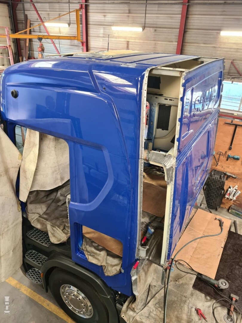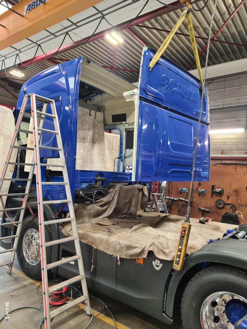 Ematri in Barneveld is vooral specialist in schadeherstel, maar ook voor een aanpassing zoals een cabine- verlenging kun je hier terecht. Zo werd bijvoorbeeld de Actros cabine van ‘The Suited Driver’ door Ematri verlengd.