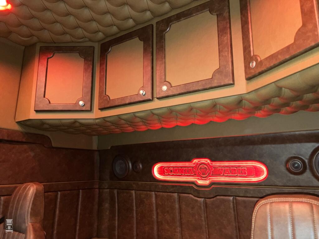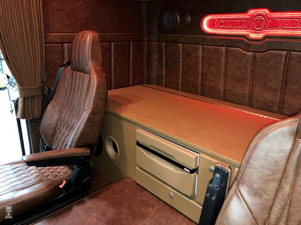 Fred koos opmerkelijk genoeg niet voor de Scania S- maar voor de R- Highline cabine. Fred: ,,Ik vind vier opstappen in mijn werk niet handig, en bovendien is de motortunnel minimaal in de R- cabine. Daarbij komt dat ik een motortunnel toch wel handig vind voor mijn papieren, mijn pakje shag en zo. Bij een vlakke vloer moet je dat altijd ergens anders kwijt. Tenslotte vind ik de R- cabine gewoon mooier in proporties dan de S, maar dat is een kwestie van smaak natuurlijk.’’