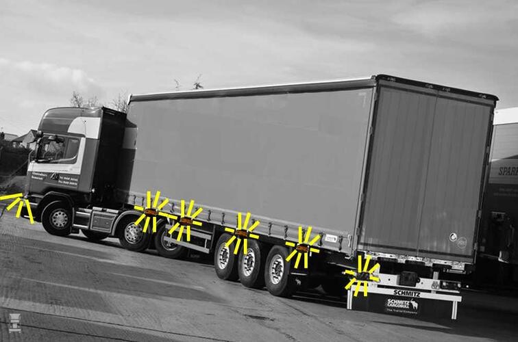 De nieuwe, Europese regel ECE R48 vermeld in paragraaf 6.5.3.1. In het United Nations Economic Commission for Europe (UNECE) staat nu dat er bij een richtingaanwijzer tenminste drie knipperlichten mee moeten gaan met de originele richtingaanwijzers. Tenminste drie dus, en daarmee mogen het dus ook meer zijn, zoals bij Schmitz.