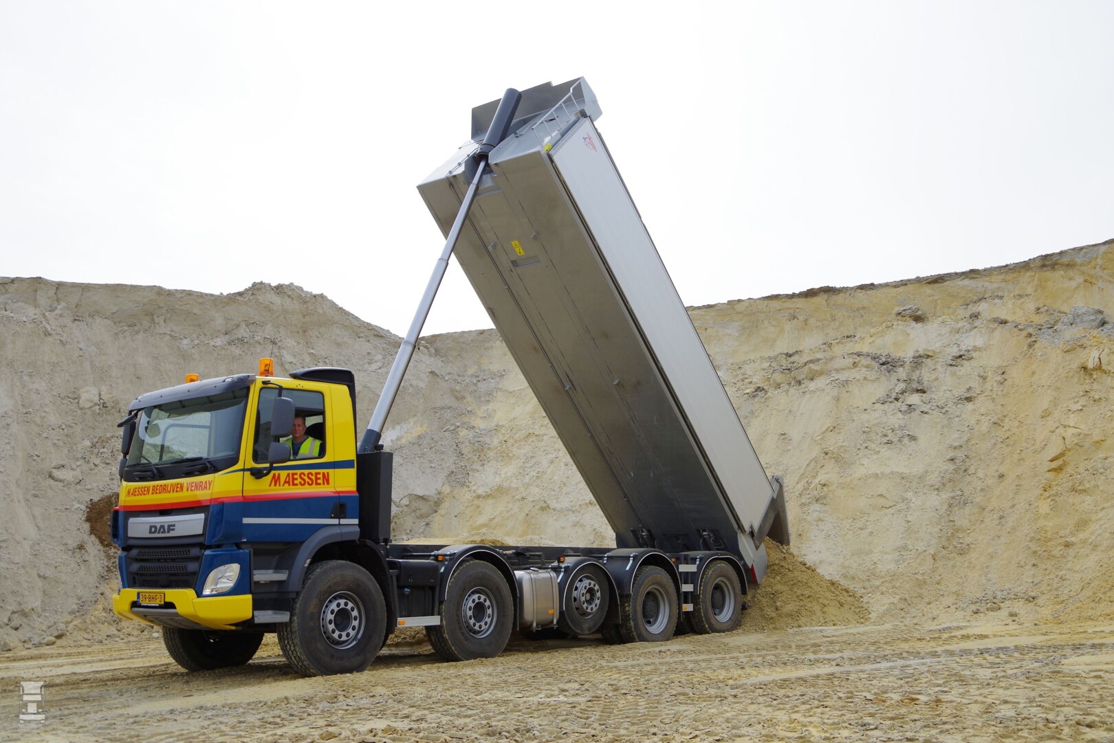 De DAF 10x4 gaat een DAF 5-asser vervangen waar de achterassen op 1,31m staan. Met deze vorige auto waren veel problemen met aslast overschrijding . Maessen Recycling heeft de nieuwe auto laten opbouwen met een “Hardox” kipper van firma Ruizeveld. Door de kipper kort tegen de cabine te bouwen worden de voorassen goed belast. Hierdoor kan de volledige 50 ton worden benut zonder aslast overschrijding.