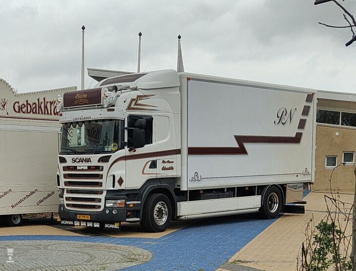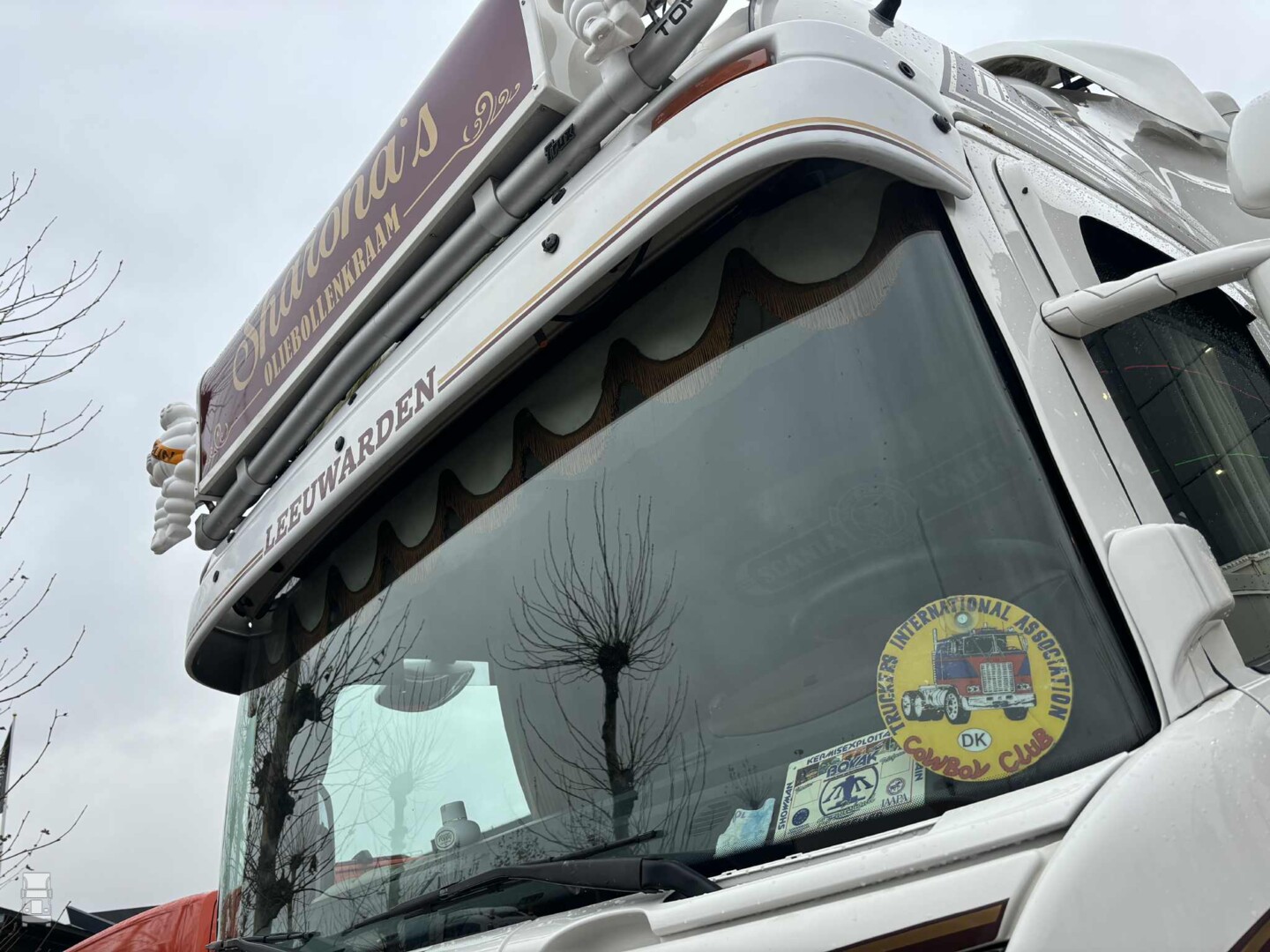 Zo'n ex lesauto is natuurlijk ideaal, want zwaar werk heeft hij nooit gedaan. Verder zijn er in de R- Highline cabine extra stoelen gemonteerd, reuze handig als je medewerkers mee wilt nemen naar de markt of naar de standplaats. De nieuwe eigenaar van de truck heeft er wat moois van gemaakt, compleet met een lichtbak en natuurlijk een TIA lichtbakje achter de voorruit. Foto Oosterpoort Alex Miedema