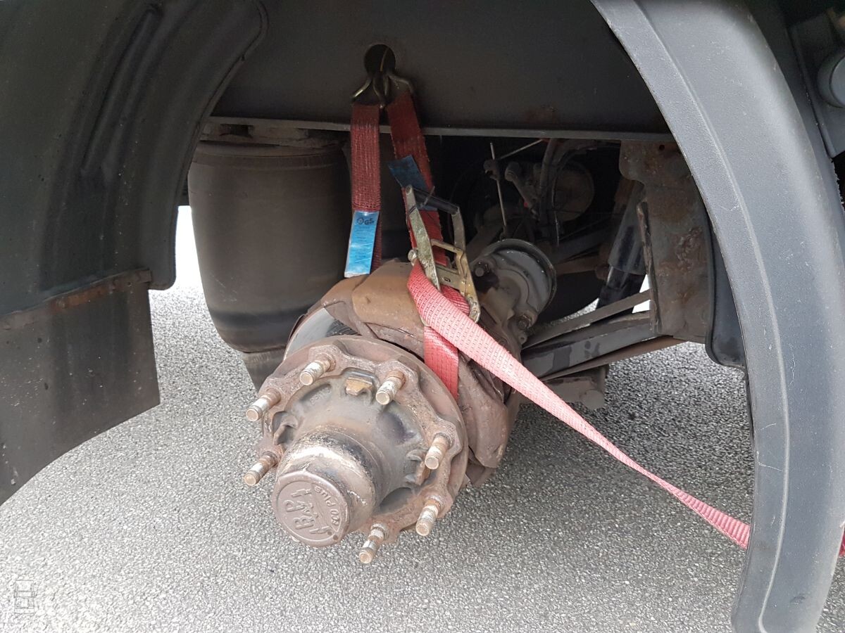 Hij zou te maken hebben gehad met een blokkerende as. Onderzoek bij de dichtstbijzijnde werkplaats leerde dat een remcilinder van de betreffende as vast zat. dus had hij voor zijn rit het wiel gedemonteerd en in de aanhanger gelegd. Omdat de as nu gevaarlijk dicht tegen de weg kwam te hangen, werd deze 'opgetild' met behulp van de spanband op de foto. De as bleef zo rakelings boven het wegdek, tot afgrijzen van de politie agenten, die natuurlijk uitlegden dat dit nooit zo de weg op had mogen gaan.