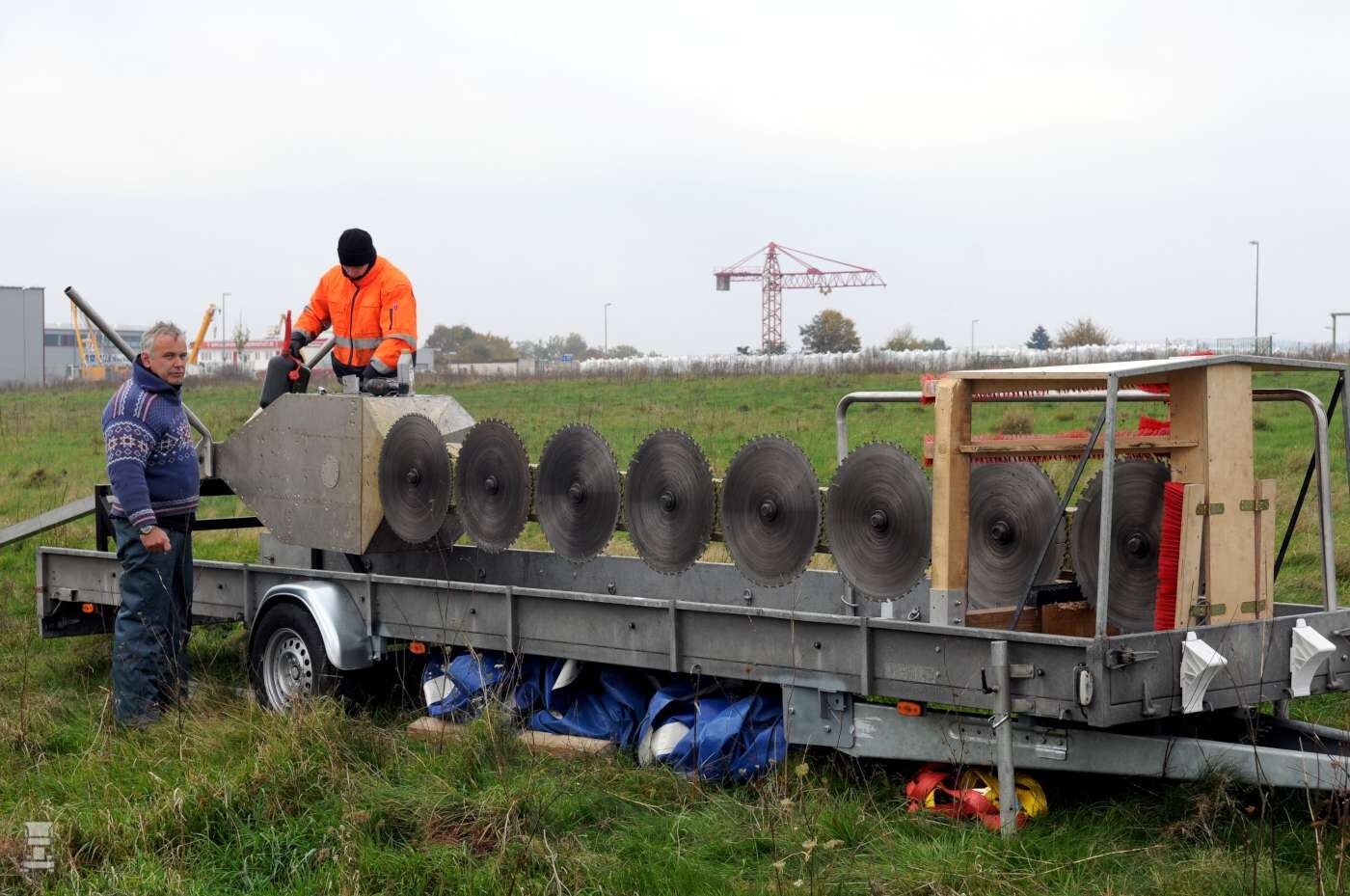 Wat je hier op de aanhangwagen ziet liggen is een RVS kast met een benzinemotor die maar liefst zes grote cirkelzagen aandrijft. Het geheel hangt onder een helikopter van waaruit het dodelijke apparaat bediend kan worden. Het doet een beetje denken aan iets uit een Mad Max film maar het eigenlijke doel is vrij suf. Het ding is namelijk bedoeld om bomen mee te snoeien.