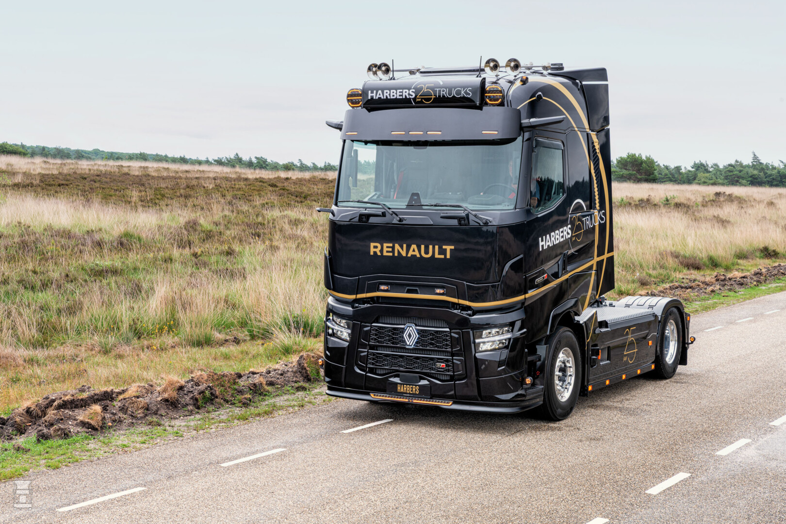 Het bijzondere design van de Volvo FH Aero 500 4x2-trekker en de Renault Trucks T High 480 4x2-trekker springt meteen in het oog. De trucks zijn gespoten in een speciaal voor de gelegenheid ontworpen kleurstelling, inclusief een verwijzing naar het 25-jarig bestaan van Harbers Trucks op de cabine.