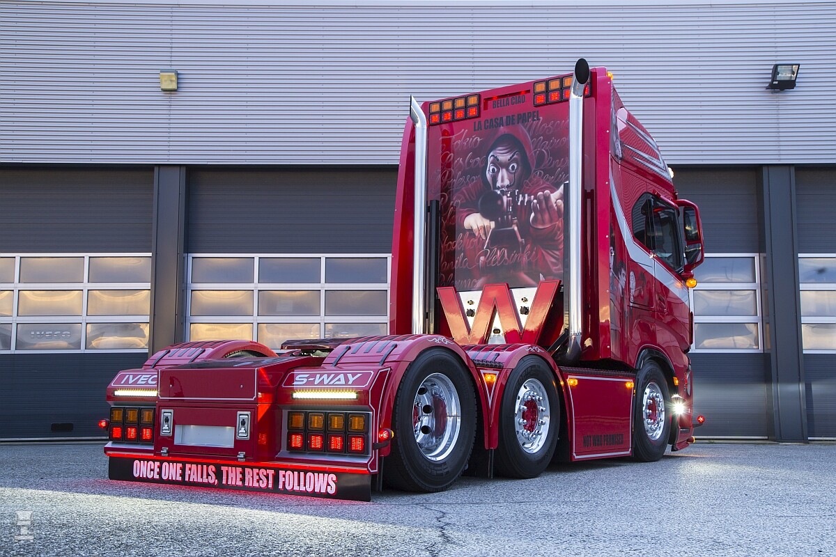 Daarna ging de truck naar MW Designs, dat op de bekende felrode basis de prachtige special-paint-afbeeldingen aanbracht op de achterwand, de zijkanten, het chassis en zelfs de spiegels. Net als de andere auto’s van Weeda kreeg ook de Iveco S-Way een thema mee uit de misdaadhoek. Het bedrijf koos namelijk eerder al voor Penoza en Escobar. De Iveco S-Way werd gewijd aan de Spaanse Netflix-serie La Casa de Papel. Hierin laten acht bankrovers zich met een aantal gijzelaars opsluiten in de Koninklijke Munt van Spanje. Om verwarring bij de politie te zaaien, draagt iedereen een rode overall en een Salvador Dali-masker. Zo weet niemand wie een gijzelaar is en wie een bankrover. Verder gebruiken de bankrovers niet hun eigen naam, maar die van steden. Vandaar de stadsnamen op de achterwand van de Iveco. Daar staat ook levensgroot één van de bankrovers afgebeeld. Of is dat misschien toch een gijzelaar?