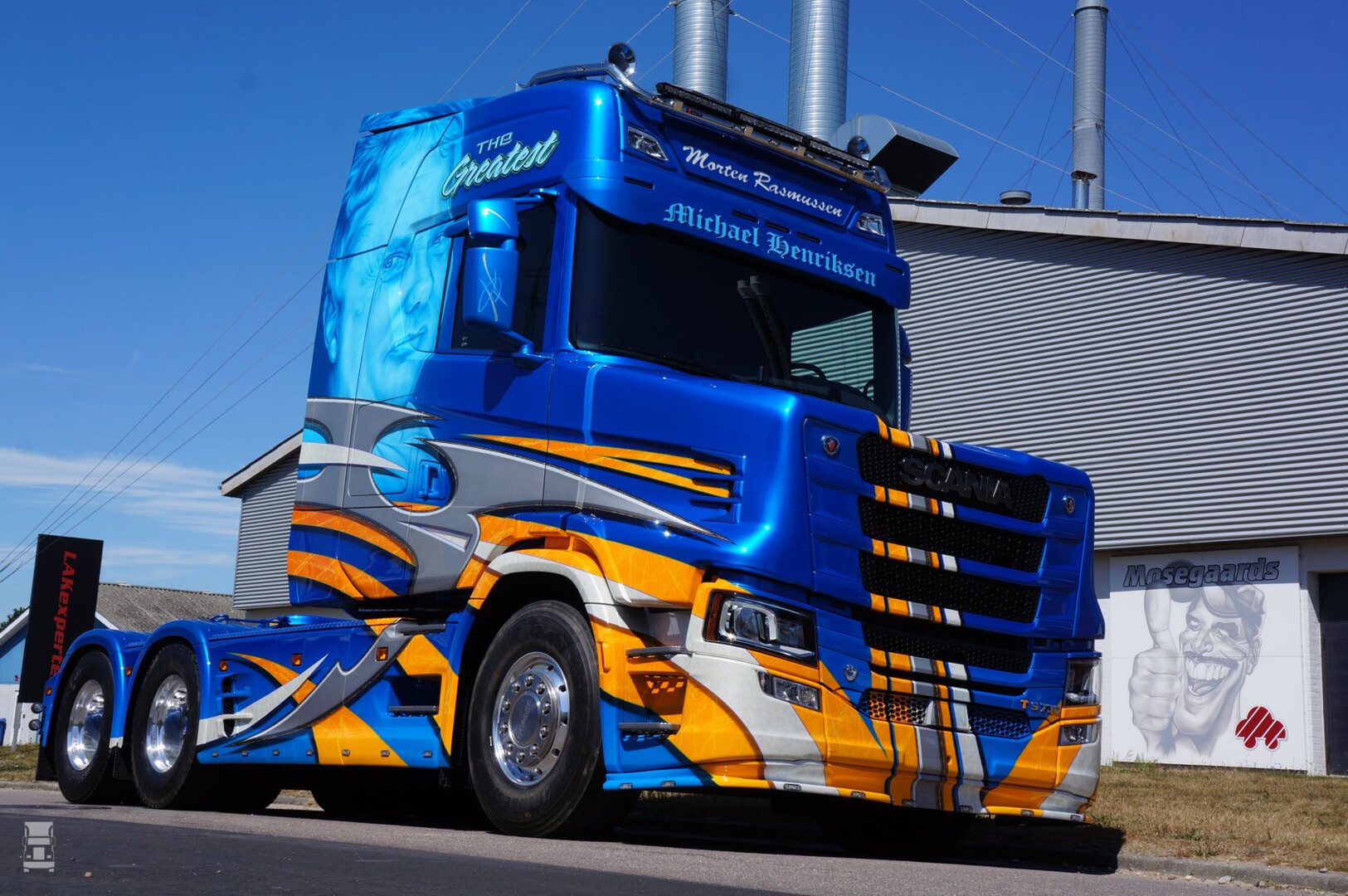 De schitterende Scania T die je hier ziet werd gebouwd door Vlastuin en daarna verkocht aan een Deen. De nieuwe eigenaar, Morten Rasmussen heeft de truck nu op spectaculaire wijze laten spuiten bij Mosegaards met een heel bijzonder thema, namelijk een eerbetoon aan de Deense transportondernemer Michael Henriksen. Michael, grondlegger van de MH Gruppen kwam in 2014 om het leven bij een helicopterongeluk.