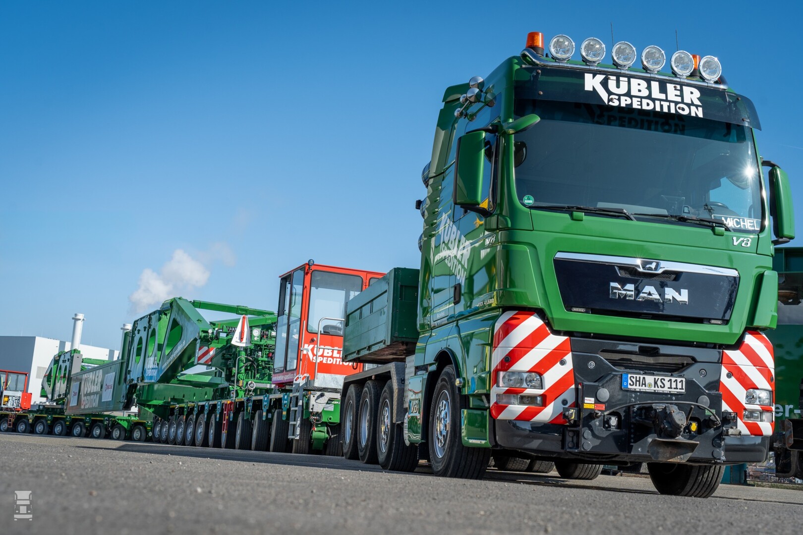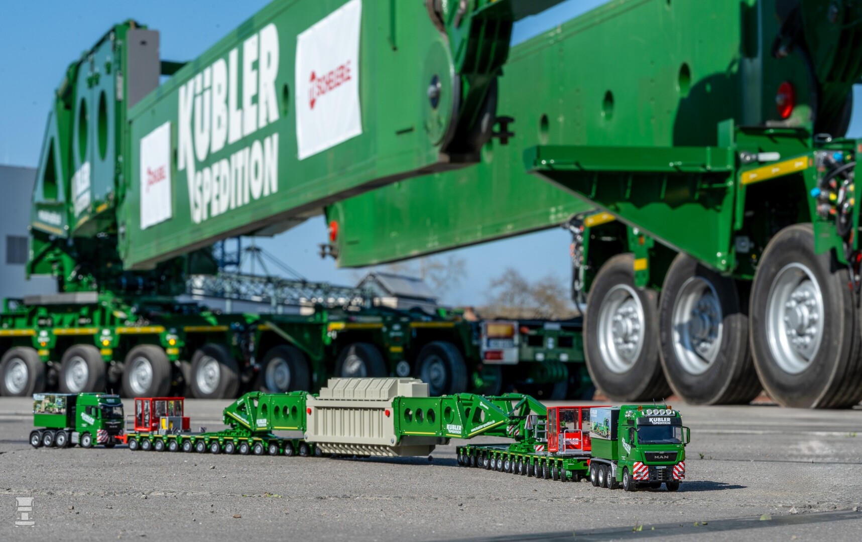 Voor de enorme constructie staat een MAN TGX 8x4 zwaar transport trekker van het vorige type, nog met een V8 in combinatie met een WSK koppelomvormer. Tijdens de presentatie werd ook het schaalmodel van deze set onthuld, gemaakt door Conrad. Voor wie een ruime vitrine heeft een echte aanrader!