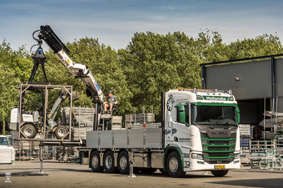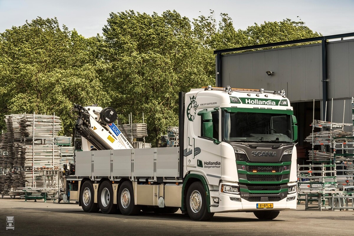 Paul Meijer, directeur eigenaar van Hollandia Steigerverhuur BV in Amsterdam zette recent een heel bijzondere Scania op de weg: een R650 8x2 bakwagen met een 650 pk V8 SCR-only motor onder een verlengde R-dagcabine met een normale dakhoogte. Achterop het chassis staat een 32 tonmeter laadkraan die onbeperkt 360ᵒ kan ronddraaien voor een optimale laad- lossnelheid. Nóg een interessant detail: de truck gaat jaarlijks niet meer dan een 50.000 kilometer rijden waarvan een groot deel op de Amsterdamse grachten.