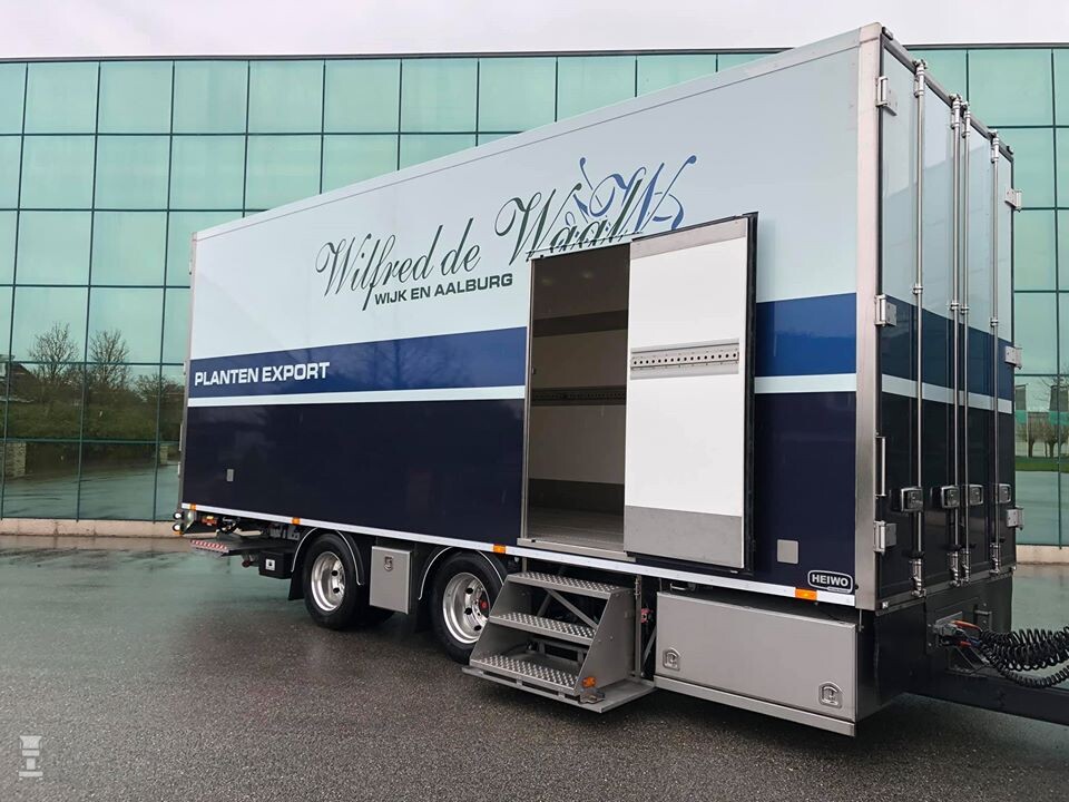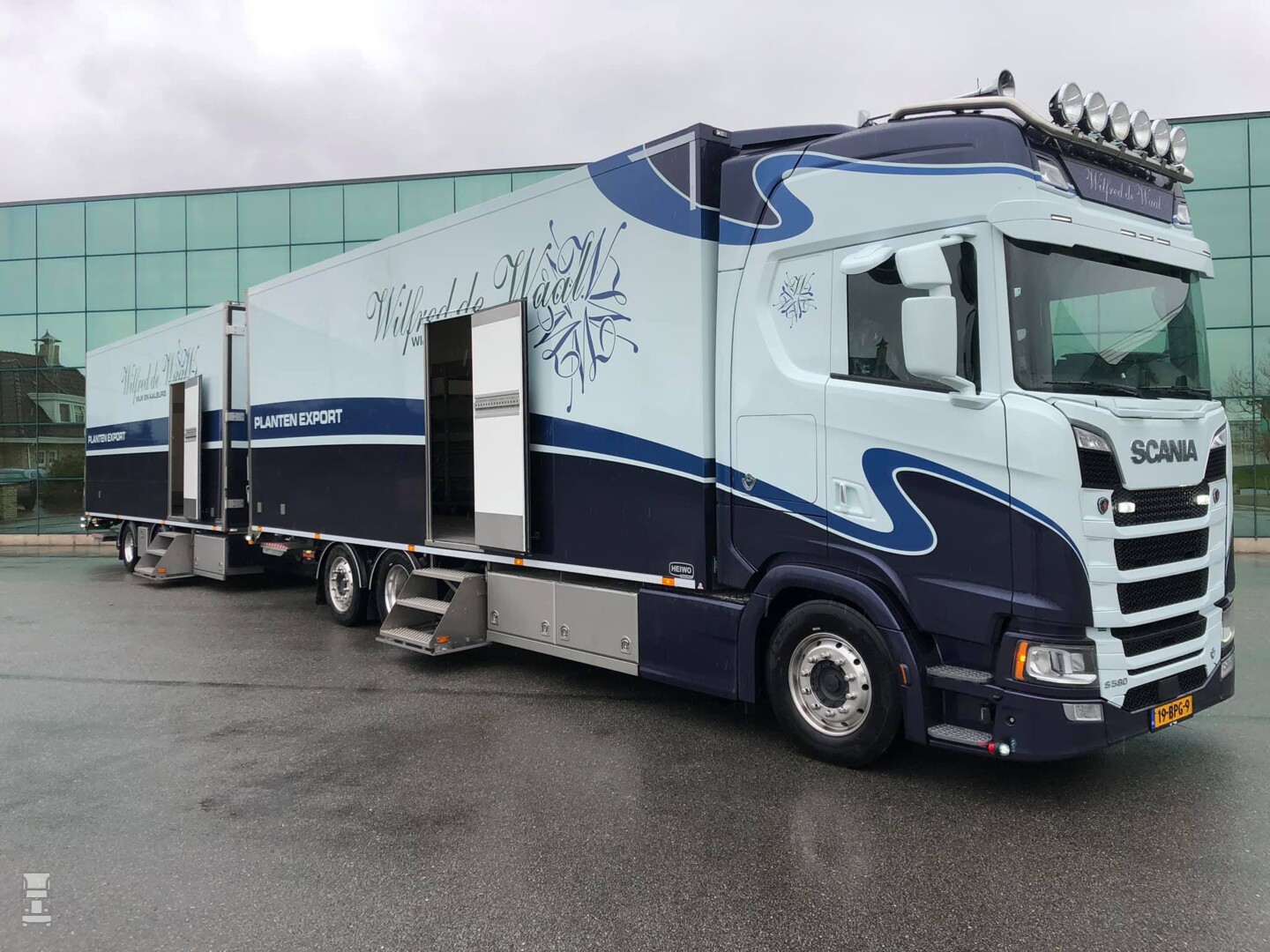 Opvallend aan de bijzonder strakke, stijvol gespoten combi is het aanzienlijke aantal kisten aan de beide chassis. Beide laadruimten zijn verder voorzien van een riante, uitklapbare trap, waardoor klanten makkelijk een kijkje in de laadruimte kunnen nemen. Wanneer de trap uitklapt, gaat de binnenverlichting meteen aan. De combinatie staat op lichtmetalen wielen en is in passende kleuren gespoten. Wilfred de Waal heeft de combi een topklasse uitstraling mee willen geven. De combinatie is verder uitgerust met meerdere camera’s om ook in het Verenigd Koninkrijk veilig te kunnen rijden.