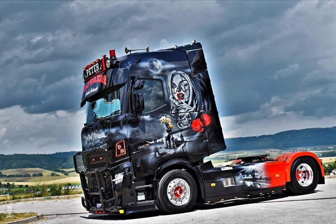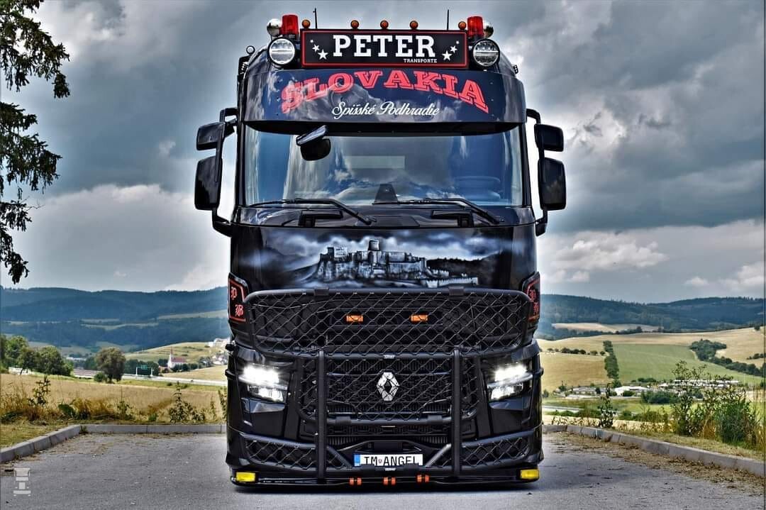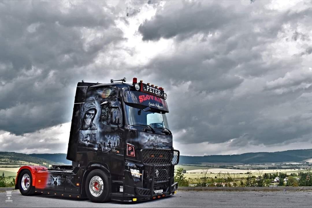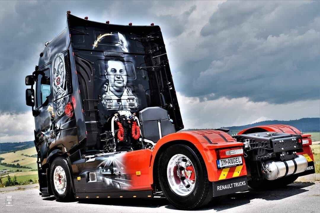 De zwarte Renault Trucks T High is rijkelijk voorzien van extra's. Zo zien we een verlaagde zonneklep, een stoere bullbar en een extra onderspoiler. Verder is de trekker woest uitgevoerd met airbrush taferelen. Je moet er maar liefhebber van zijn, maar opvallen doet ie zeker, en hiermee is bewezen dat zo'n Renault Truck ook niet misstaat op een truckshow!